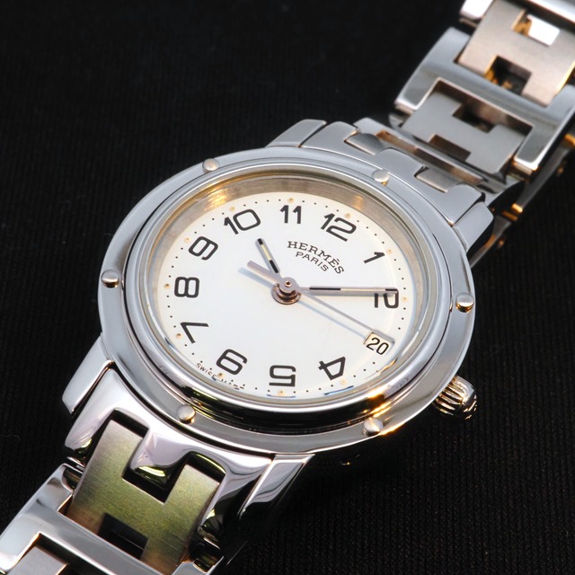 商品詳細: - ブランド名:エルメス - モデル名:クリッパー - モデルサイズ:レディース - 製造年代:2000年代 - ムーブメント:クオーツ - ケース素材:SS - ベルト:SSブレスレット - 付属品:弊社保証書、ケース - 保証:1年間 - 状態:アンティーク(中古) - メンテナンス状態:電池交換済み - 防水機能:非防水 特徴・おすすめポイント: エルメスの人気シリーズ《クリッパー》は、丸みのあるケースと“H”モチーフのステンレスブレスレットが特徴の、上品さと使いやすさを兼ね備えたモデルです。こちらの時計は、明るいホワイト文字盤にシルバーのブレスレットが組み合わされていて、すっきりと爽やかな印象。数字のインデックスも見やすく、デイト表示もあるので、普段使いにもとても便利です。 ステンレスブレスはアクセサリー感覚で着けやすく、アンティーク時計が初めての方でも気軽に楽しめるデザイン。ホワイト文字盤はどんな服装にも合わせやすく、シンプルなTシャツやデニムに合わせれば清潔感のある雰囲気に、シャツやジャケットなどのきれいめスタイルには上品さをプラスしてくれます。ワンピースやモノトーンコーデにも自然に馴染み、手元を明るく見せてくれる万能さがあります。 気取りすぎず、それでいてちゃんとエルメスらしい上質さを感じられる《クリッパー》。 毎日のコーデにほどよい高級感を添えてくれる、頼れる一本です。 ⚠️【ご購入前にご確認ください】⚠️ 中古品のお時計に関して、新品・現行モデルとは異なり、下記の点にご注意いただきますようお願いいたします。保証の対象外となります。 ・革ベルトタイプは状態の良いものを使用していますが、新品ではございません、気になる方は交換をお勧めいたします。 ・高い精度や防水性能。 ・水入り、湿気入りが原因の不具合。 ※汗や水分、湿気などは時計内部に深刻なダメージを与える原因となります。 ・部品破損による不具合。 ※繊細な構造のため、落下や衝撃などにはお気をつけください。 定期的なメンテナンスをお勧めいたします。 中古時計の特性をご理解のうえ、ご購入いただけますと幸いです。