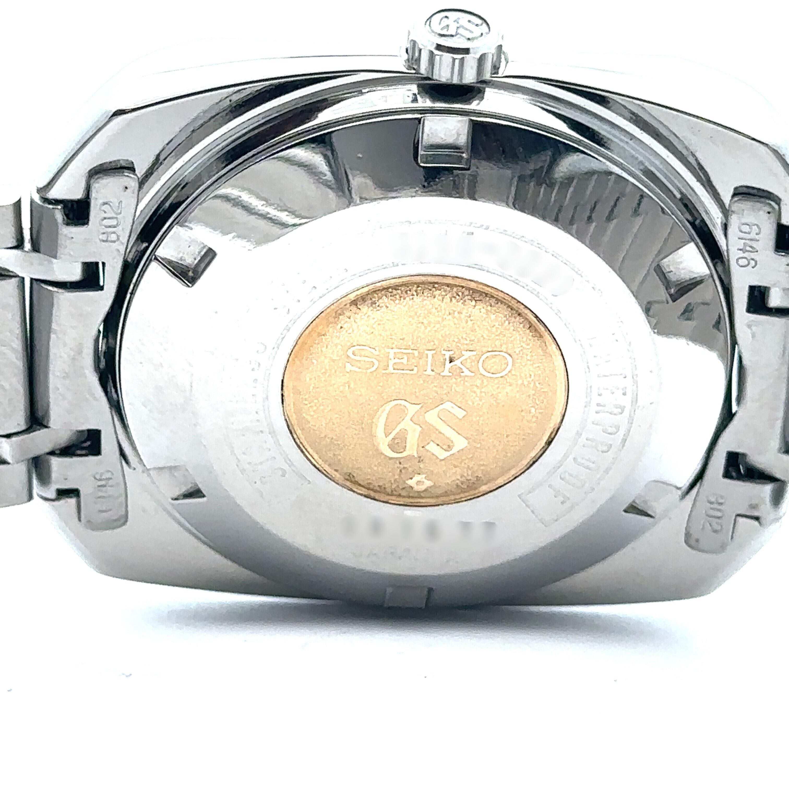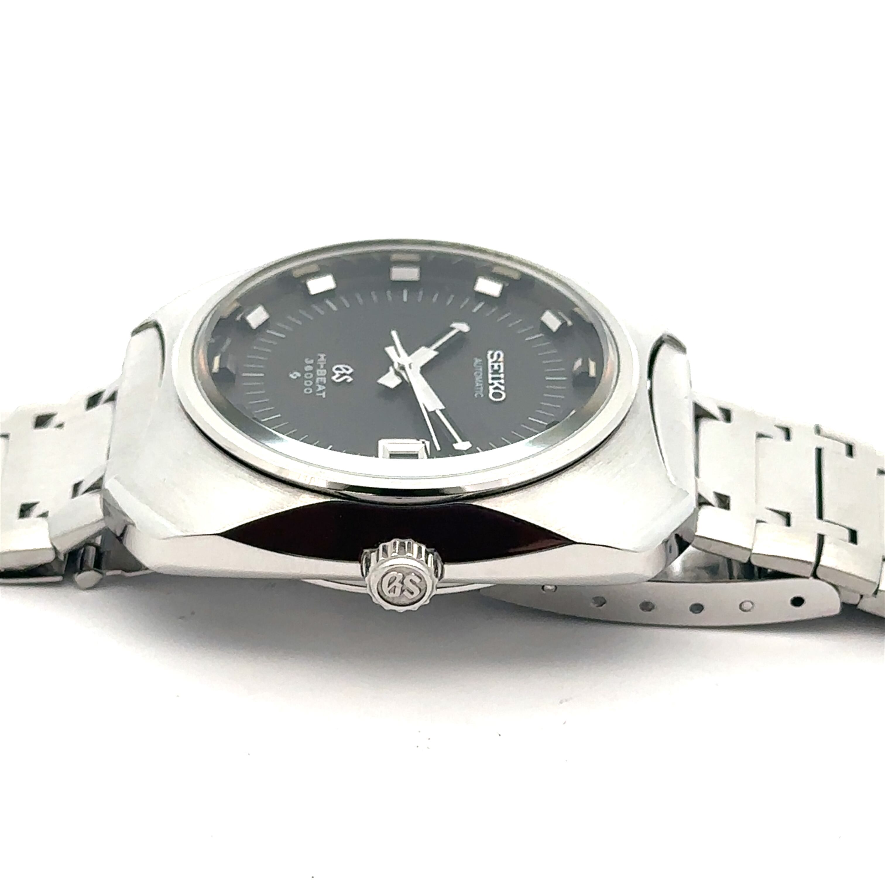 日本が誇る高級時計ブランド「グランドセイコー」から、シンプルで洗練された一本をご紹介。ステンレススチールのケースとブレスレットに、黒の文字盤が映えるデザイン。シルバーのインデックスと針が上品に輝き、3時位置には日付表示もついていて、実用性もバッチリです。