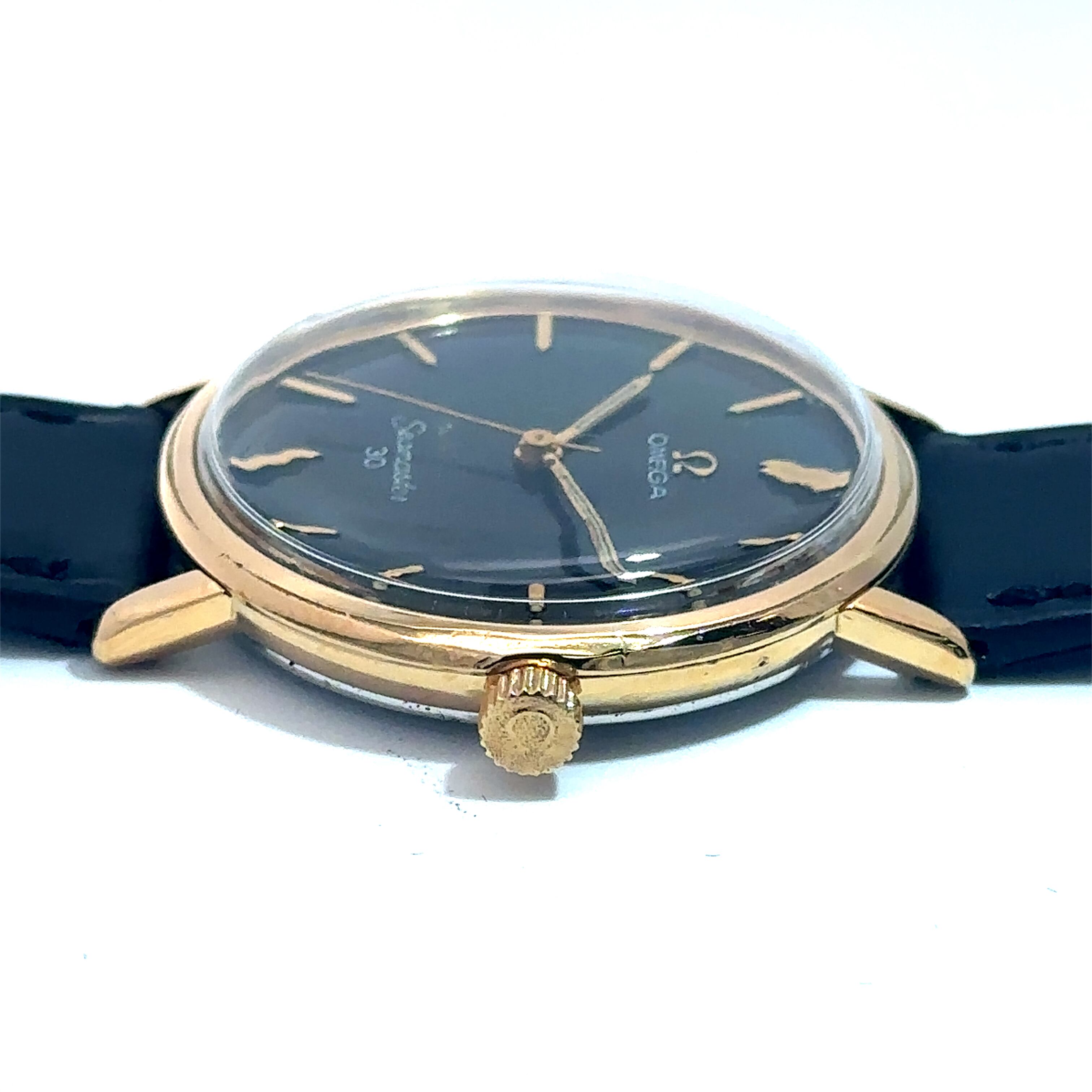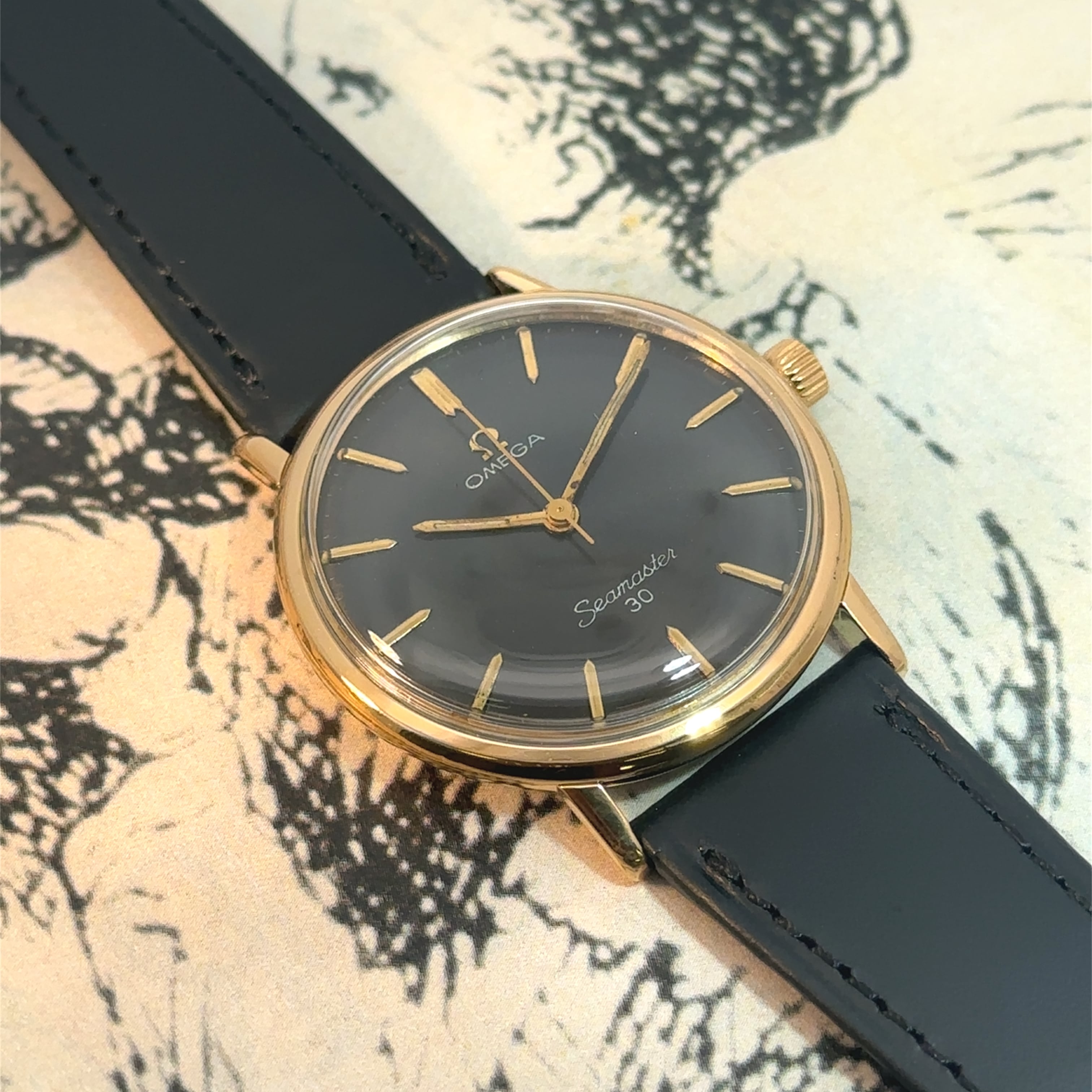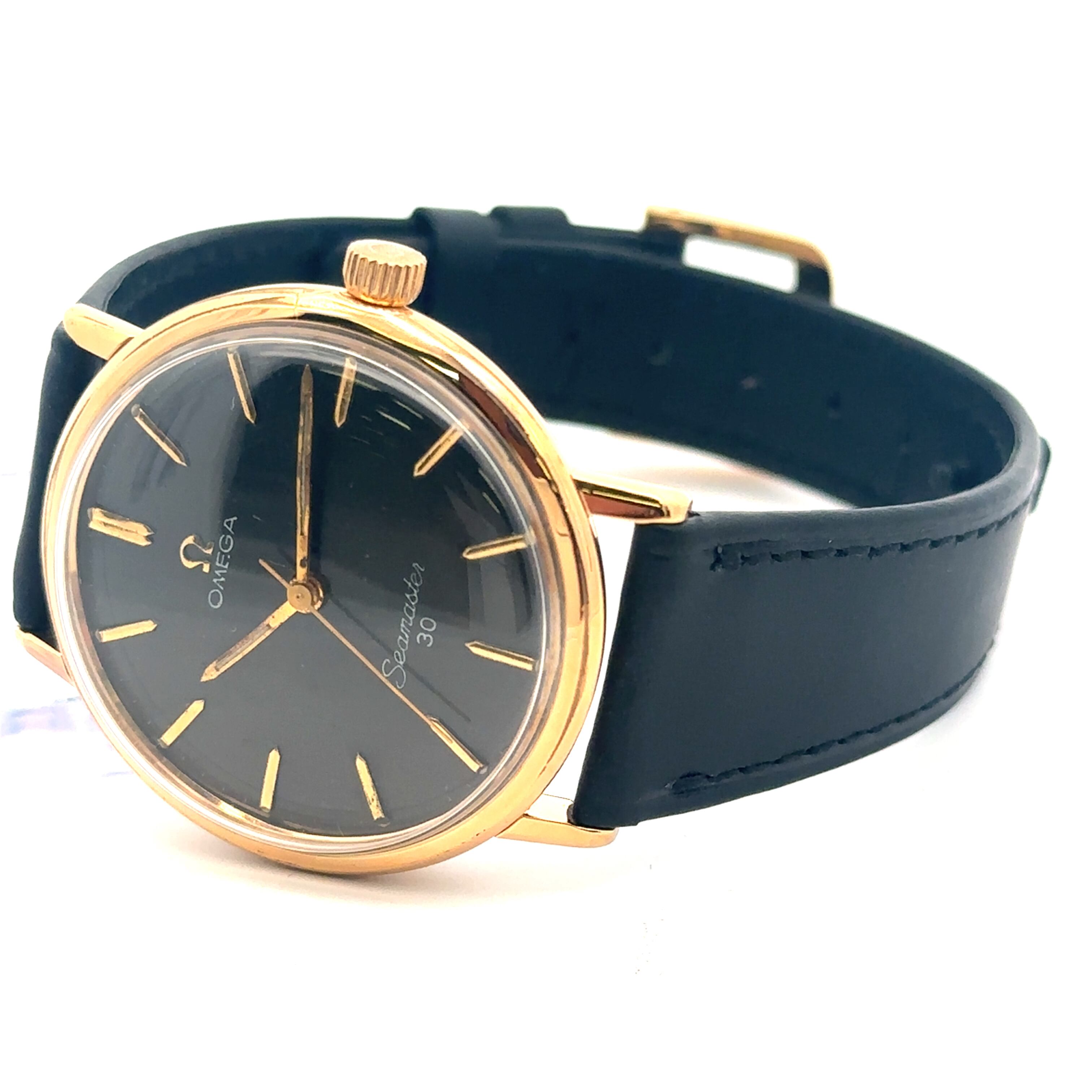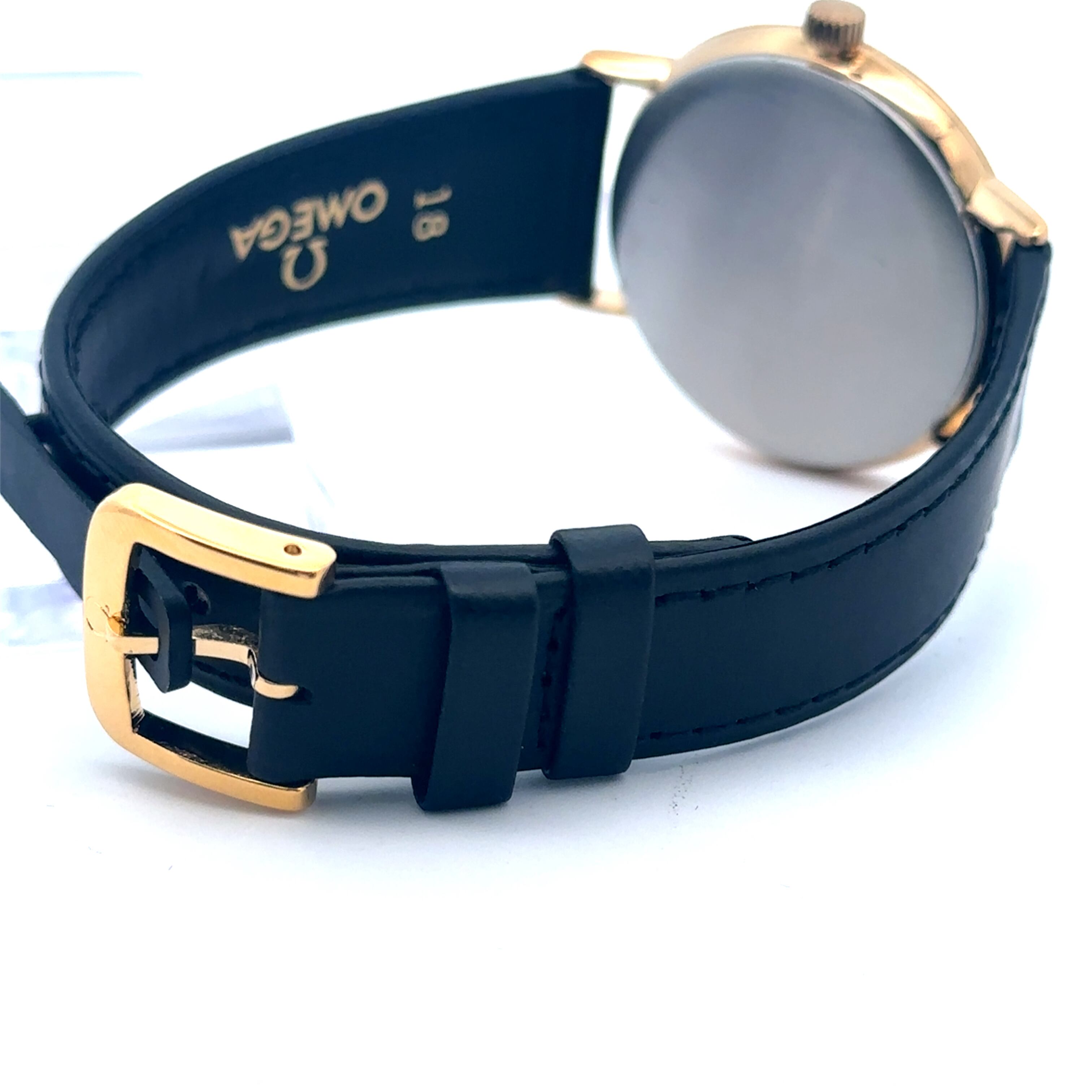 クラシックで気品あるデザインが魅力の「オメガ シーマスター」。黒の文字盤にゴールドのインデックスと針が映え、ゴールドのケースと黒のレザーベルトが絶妙なバランスで組み合わさった一本です。シンプルながらも存在感があり、手元に上品なアクセントを加えてくれます。