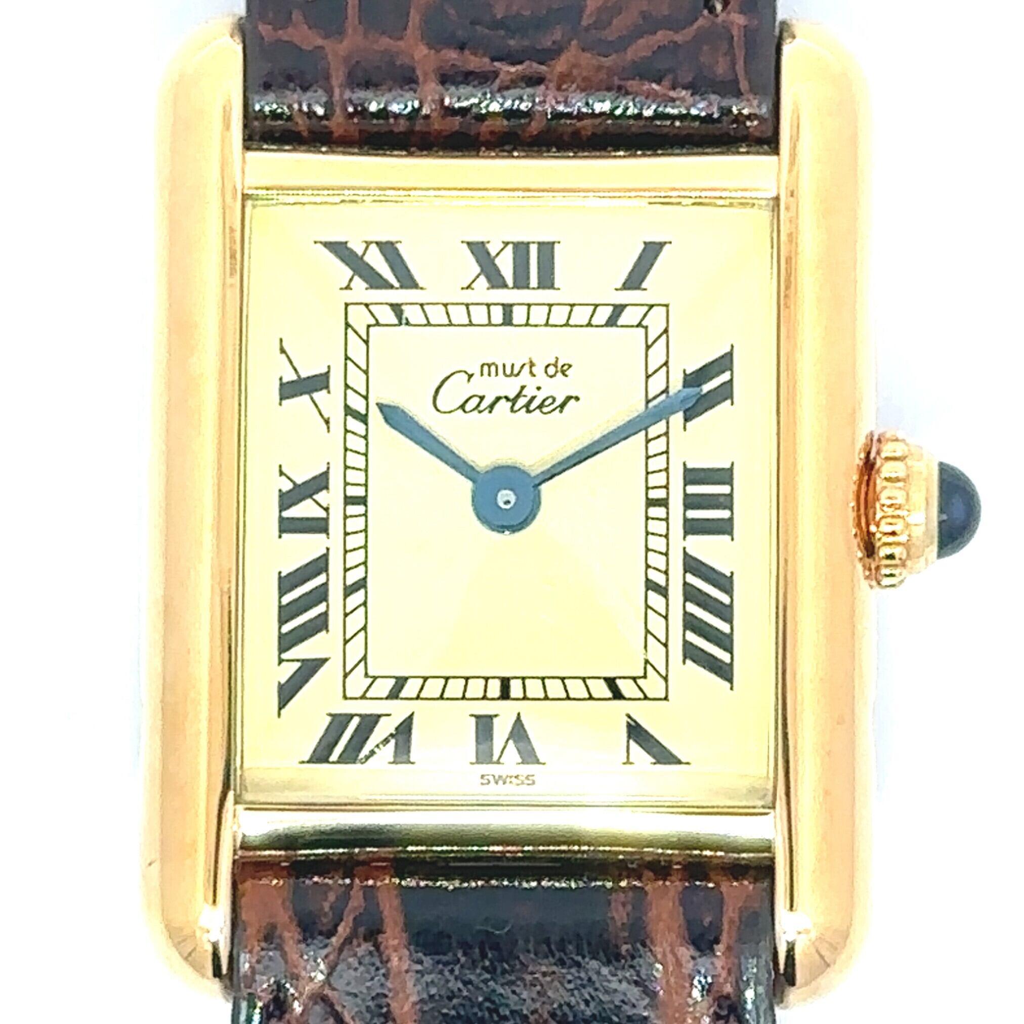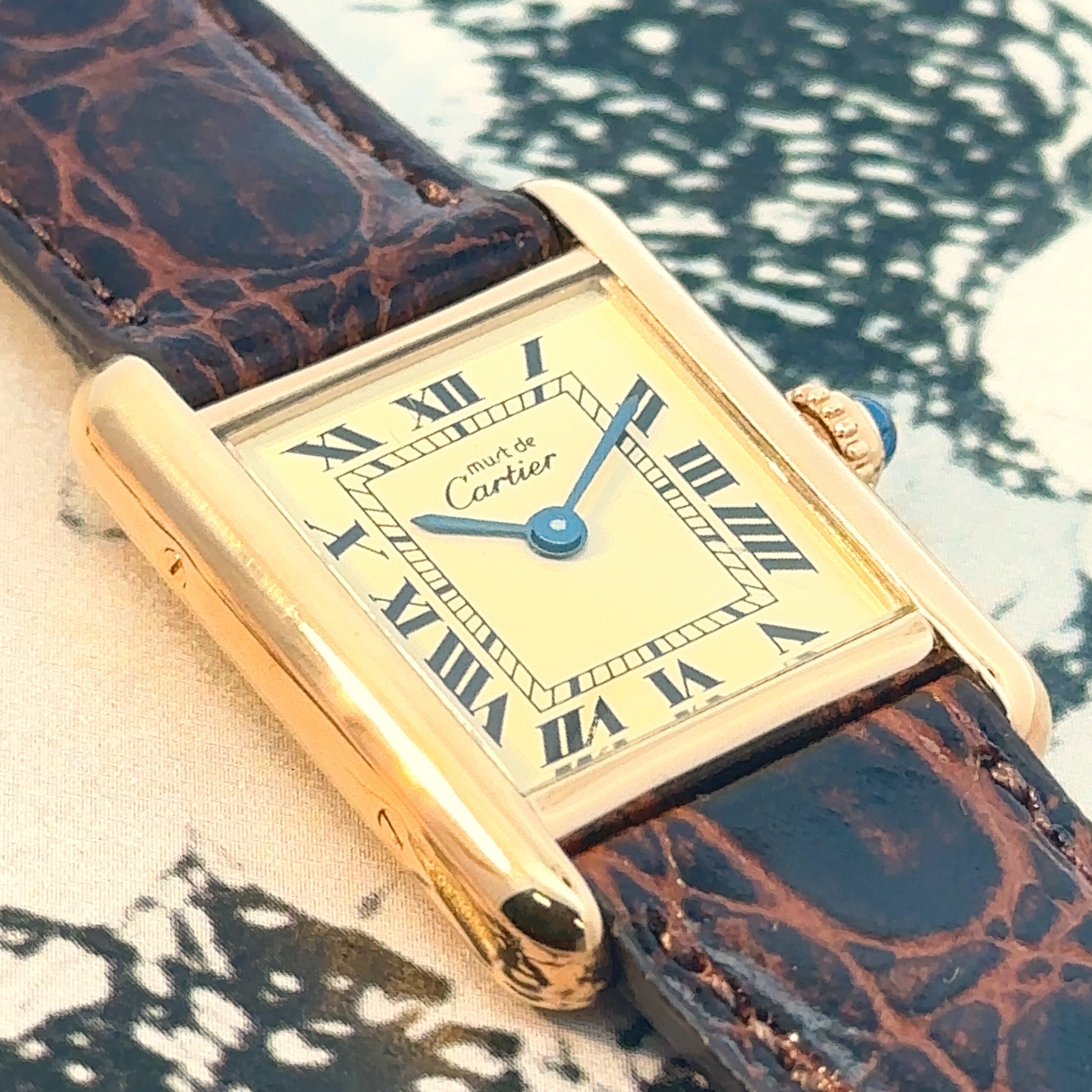 カルティエの名作「マストタンク」は、ゴールドのスクエアケースにローマ数字の文字盤が映える、クラシックで洗練されたデザインです。