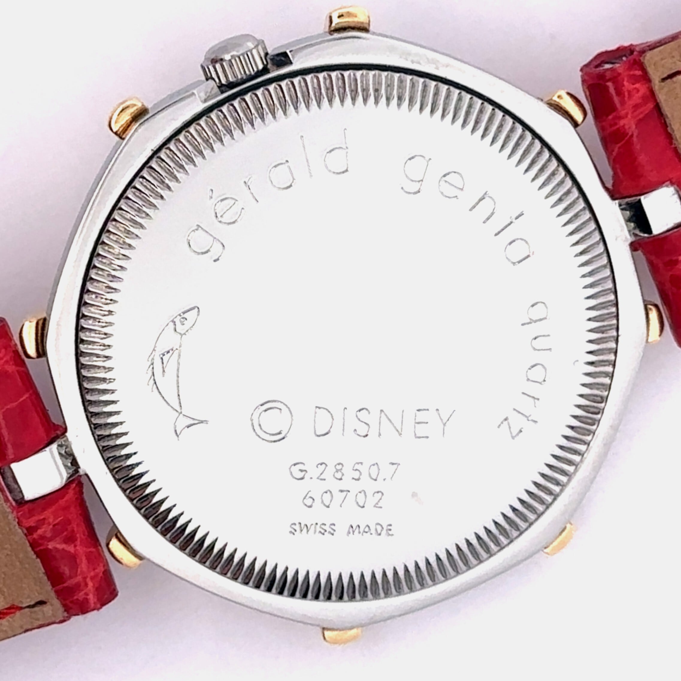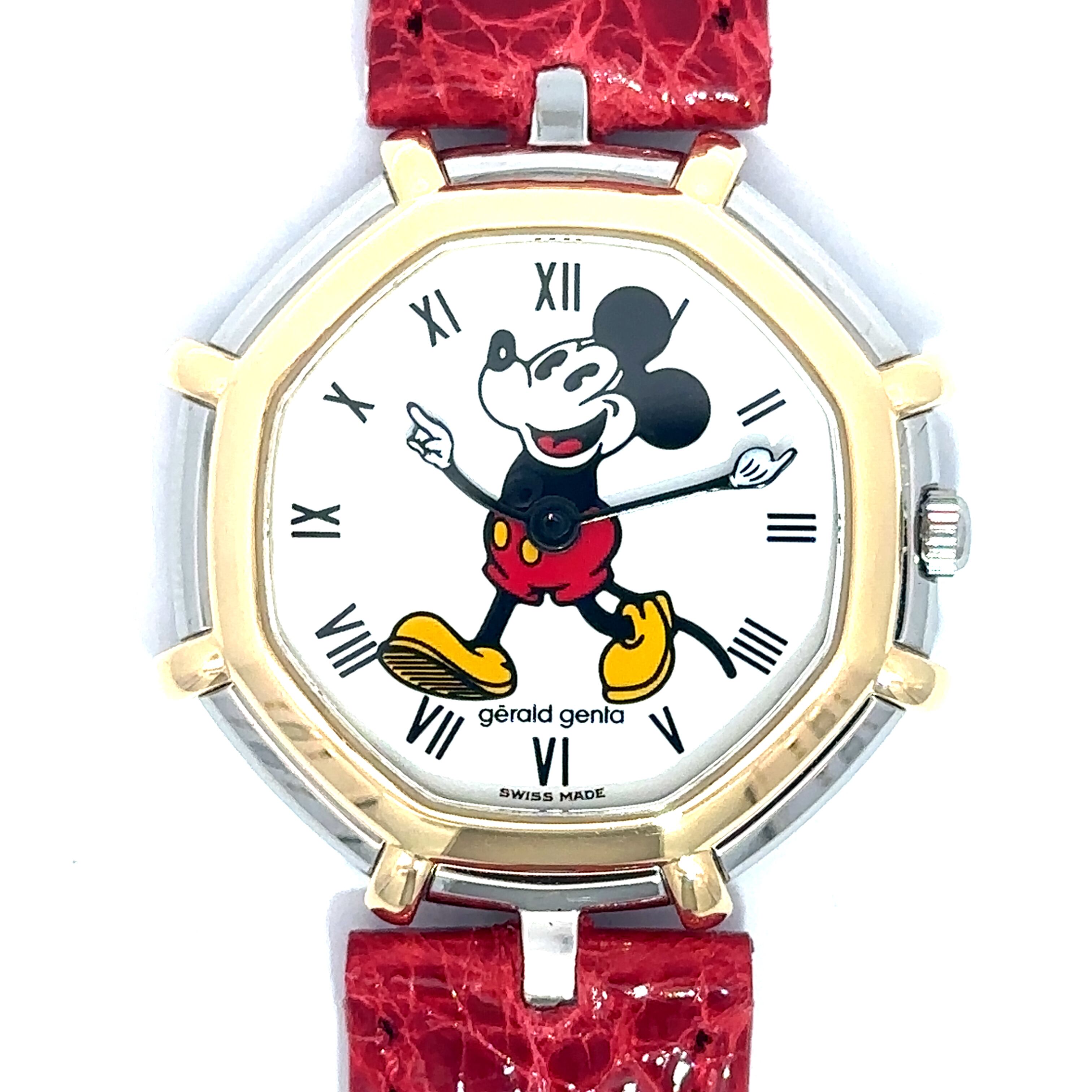 ゴールドカラーのケースに、鮮やかな赤のレザーストラップ。文字盤にはミッキーが堂々と登場し、腕を使って時間を指し示すユニークなデザイン。