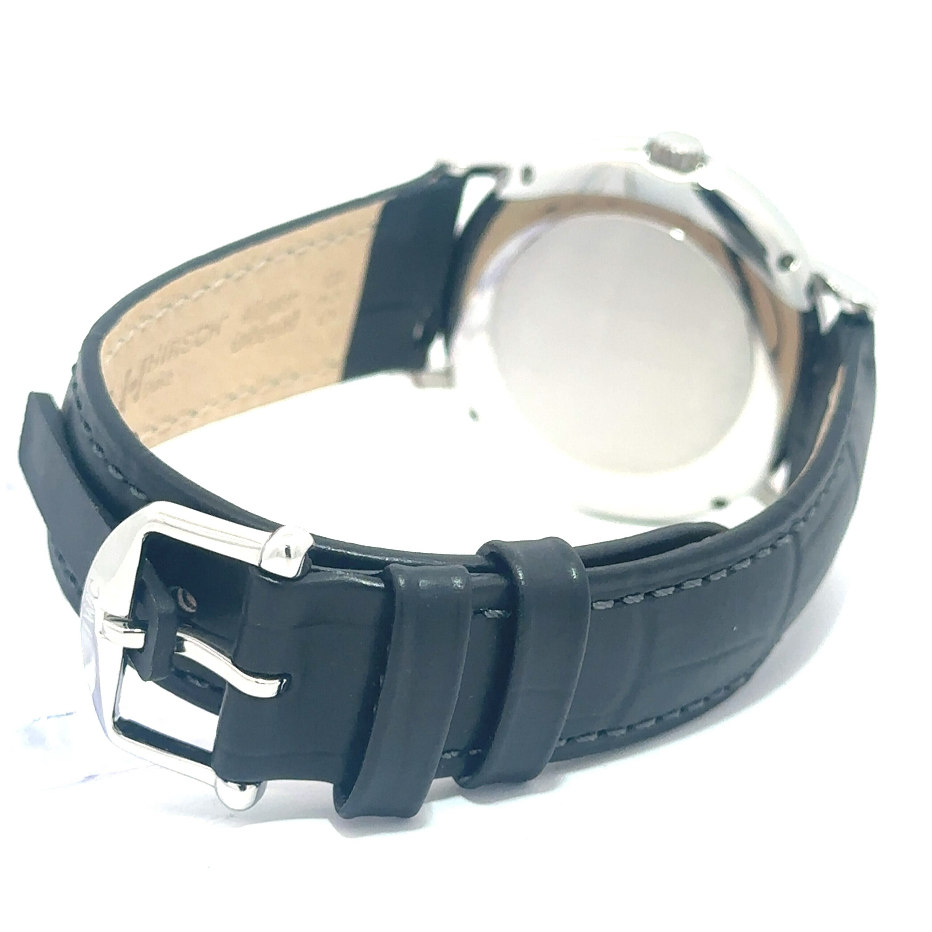 シンプルで上品なデザインが魅力の「IWC ポートフィノ」。白い文字盤に細めのインデックスと針、そして3時位置には日付表示があり、見やすさと美しさを兼ね備えています。シルバーのケースにブラックのレザーストラップが組み合わさり、落ち着いた雰囲気を演出。自動巻き(オートマチック)なので、使うたびに愛着が湧く一本です。