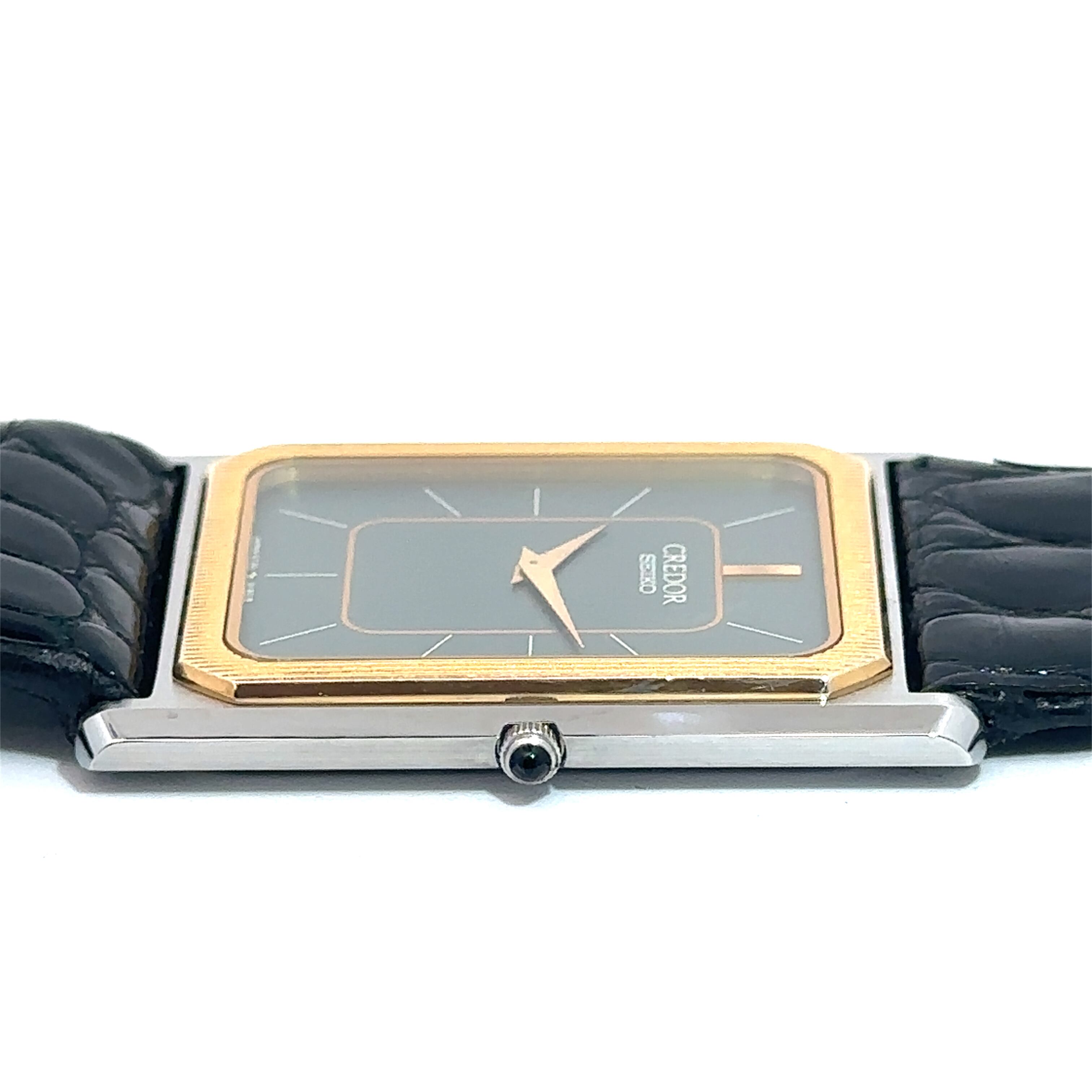 上品でクラシックな雰囲気が魅力の「セイコー クレドール」。ゴールドのベゼルにグレーの文字盤、そして黒のレザーベルトという組み合わせが、大人の落ち着きを感じさせる一本です。スクエア型のフェイスが個性的で、手元にさりげないアクセントを加えてくれます。