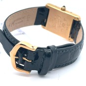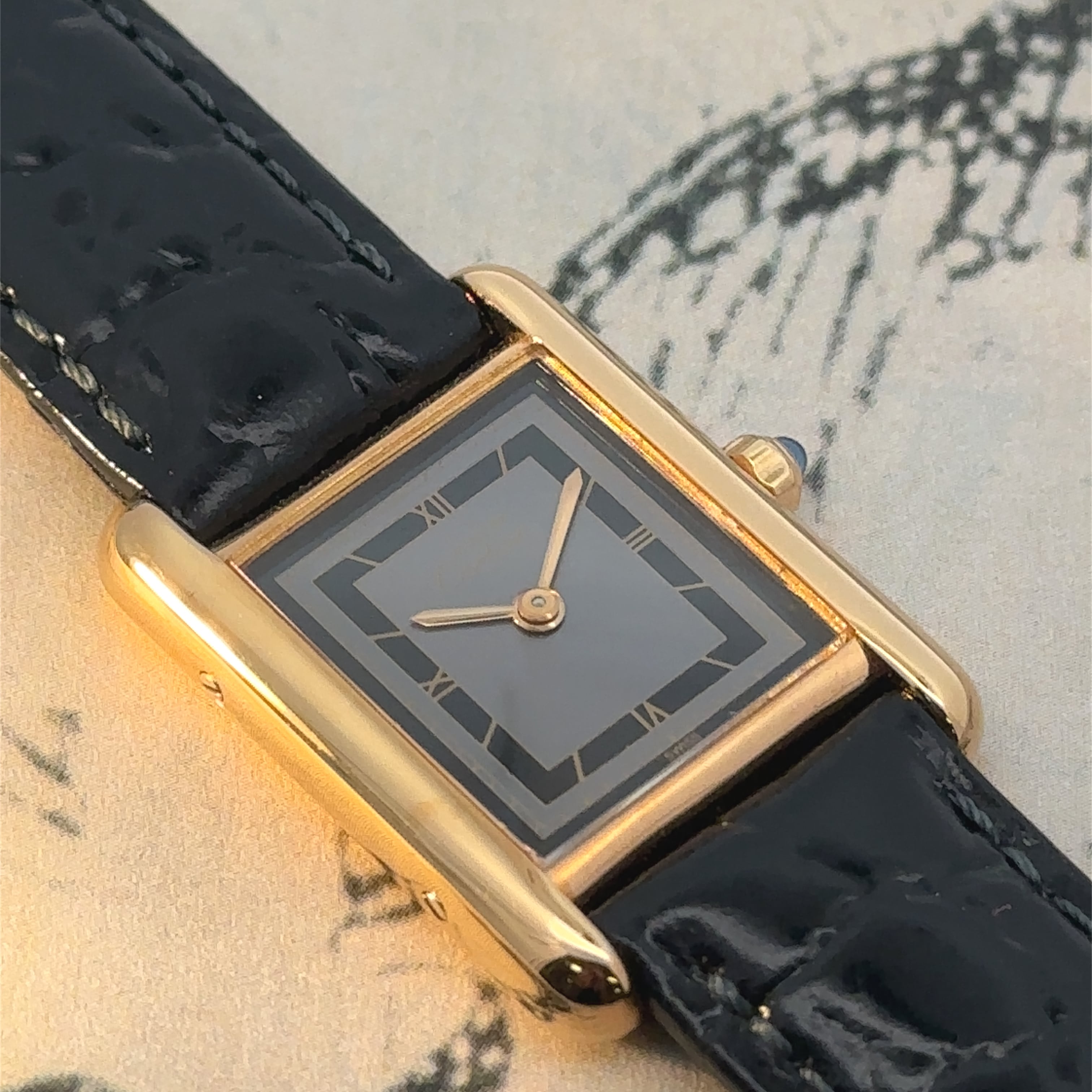 クラシックで洗練されたデザインが魅力の「カルティエ マストタンク」。長方形のゴールドケースに、ローマ数字が並ぶシンプルな文字盤。そして黒のレザーベルトが、上品さと落ち着きを演出してくれる一本です。