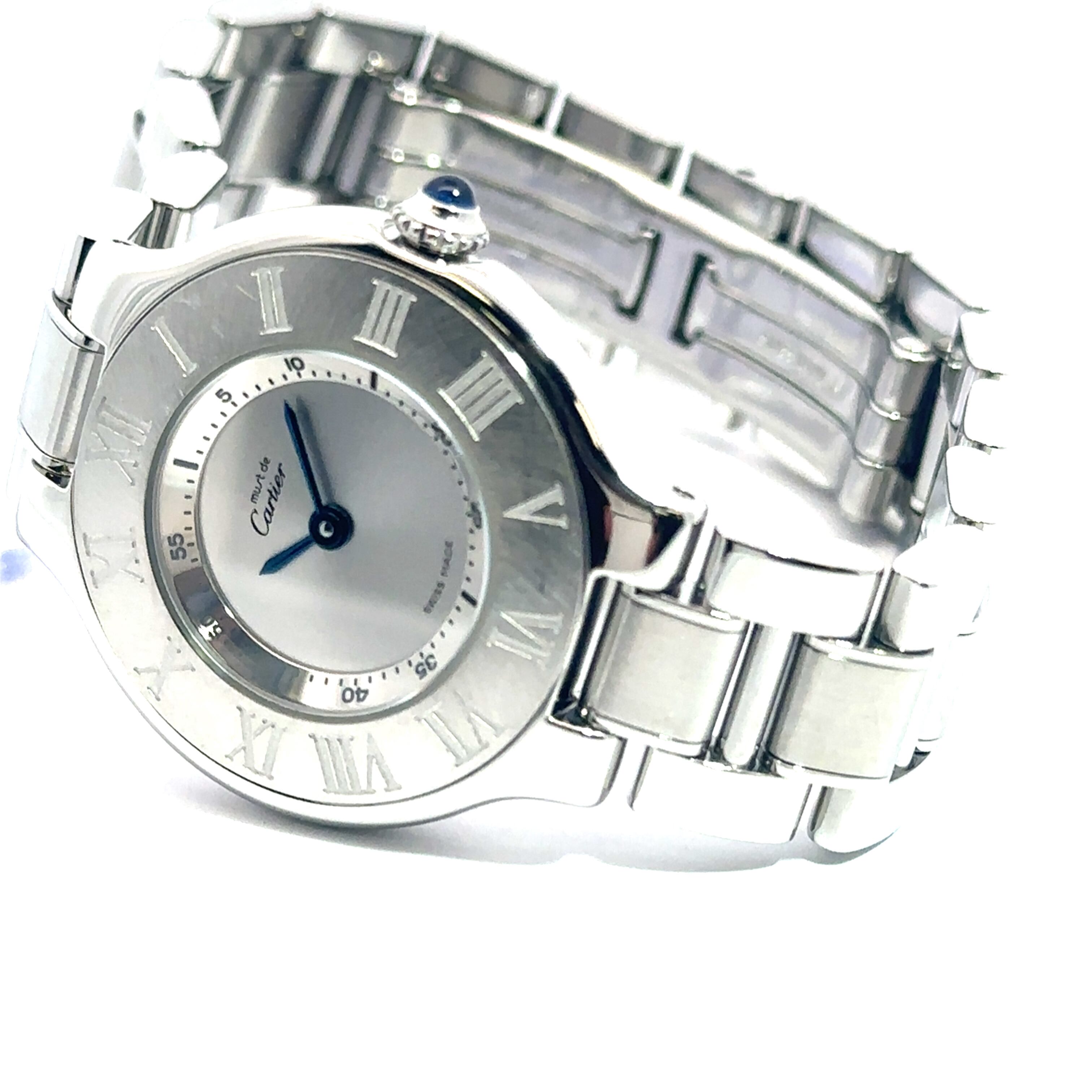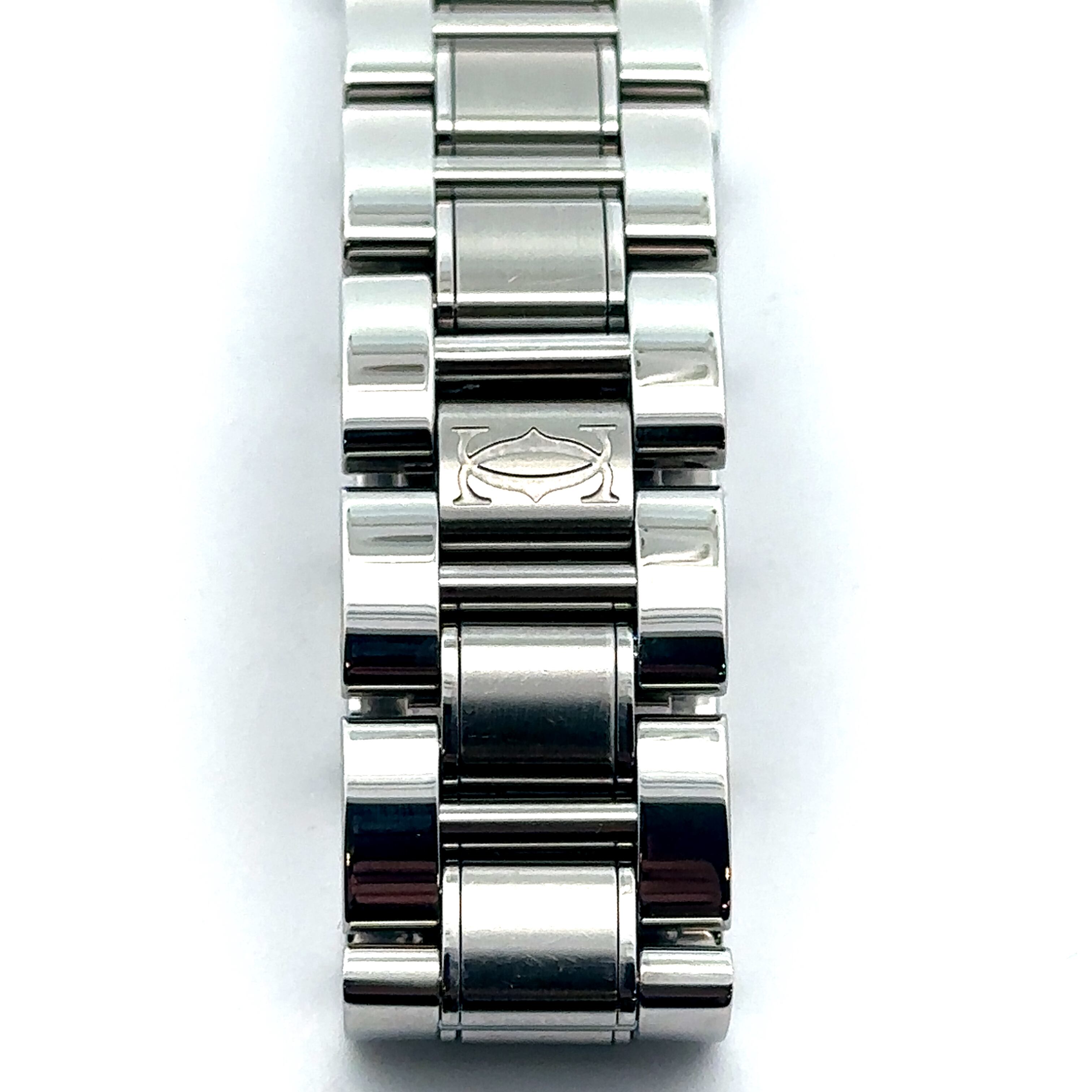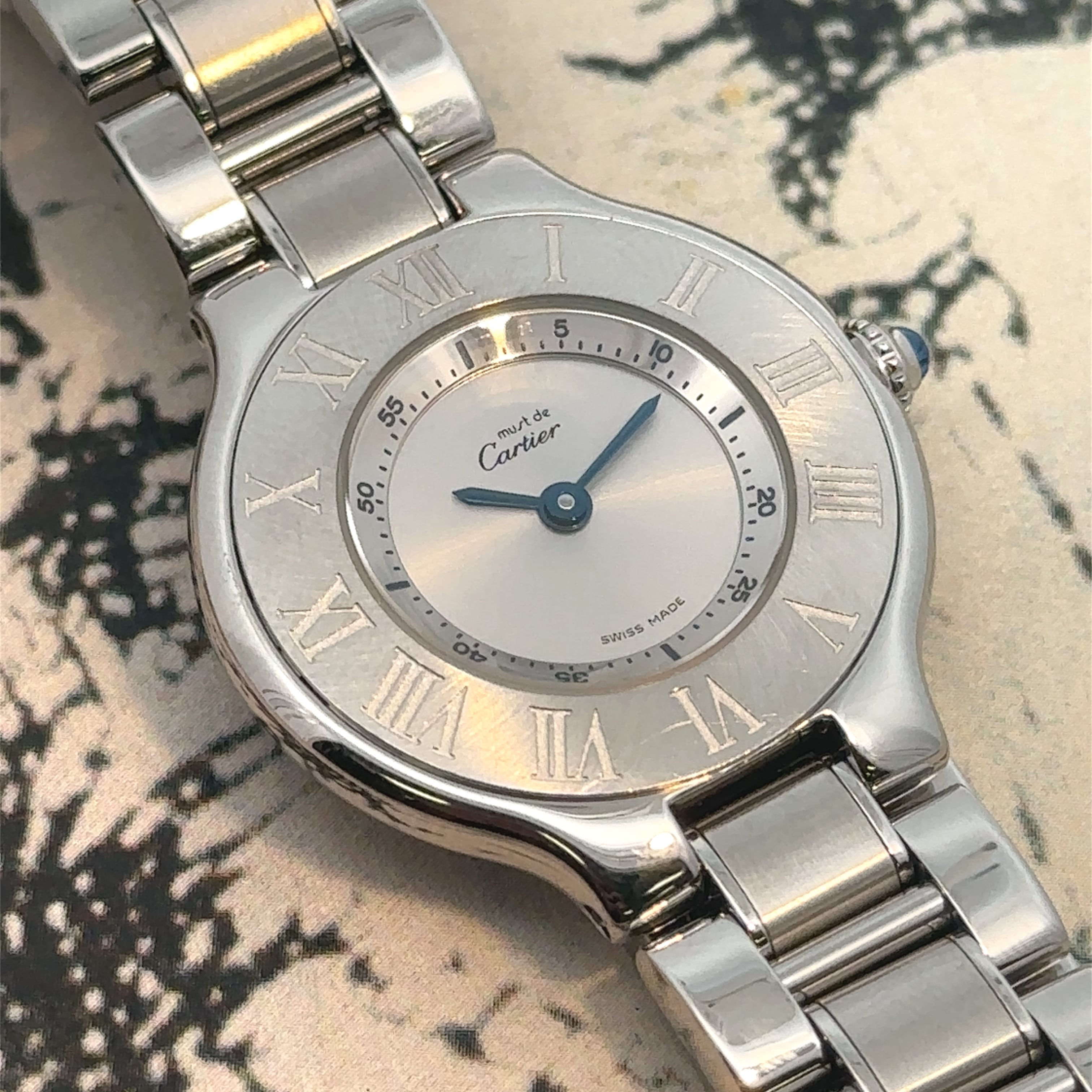 エレガントで洗練された雰囲気が魅力の「カルティエ マスト21」。シルバーの文字盤にローマ数字が並び、ブルーの針がさりげないアクセントに。6時位置には日付表示があり、実用性も兼ね備えています。ステンレススチールのブレスレットは、光沢のあるリンクが美しく、手元を華やかに演出してくれます。
