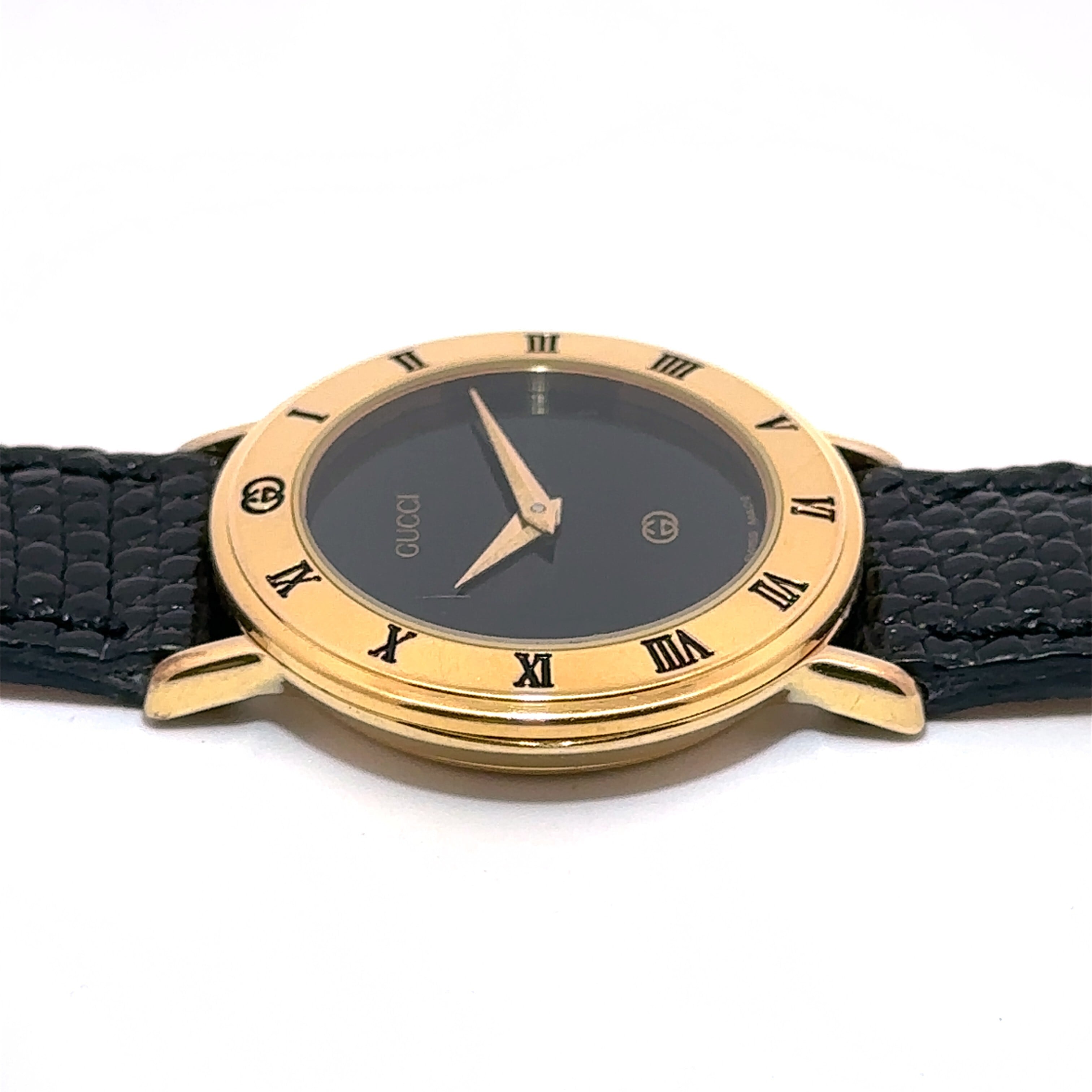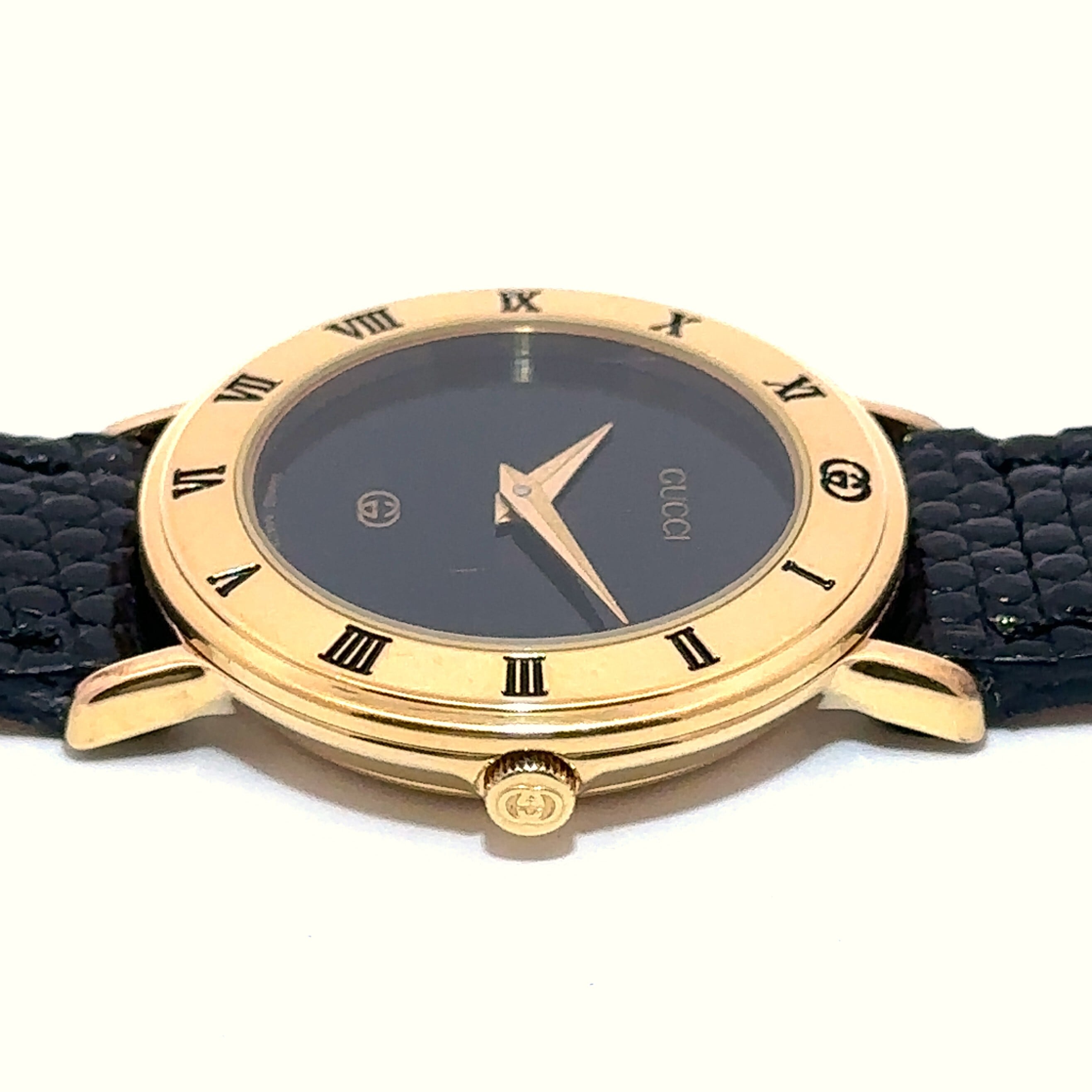 ローマ数字のインデックスが付いたゴールドのラウンドケースとブラックの文字盤というデザインはまさに大人のためのエレガントな一本。文字盤にさりげなく入った「GUCCI」のロゴが、上質さを引き立てます。