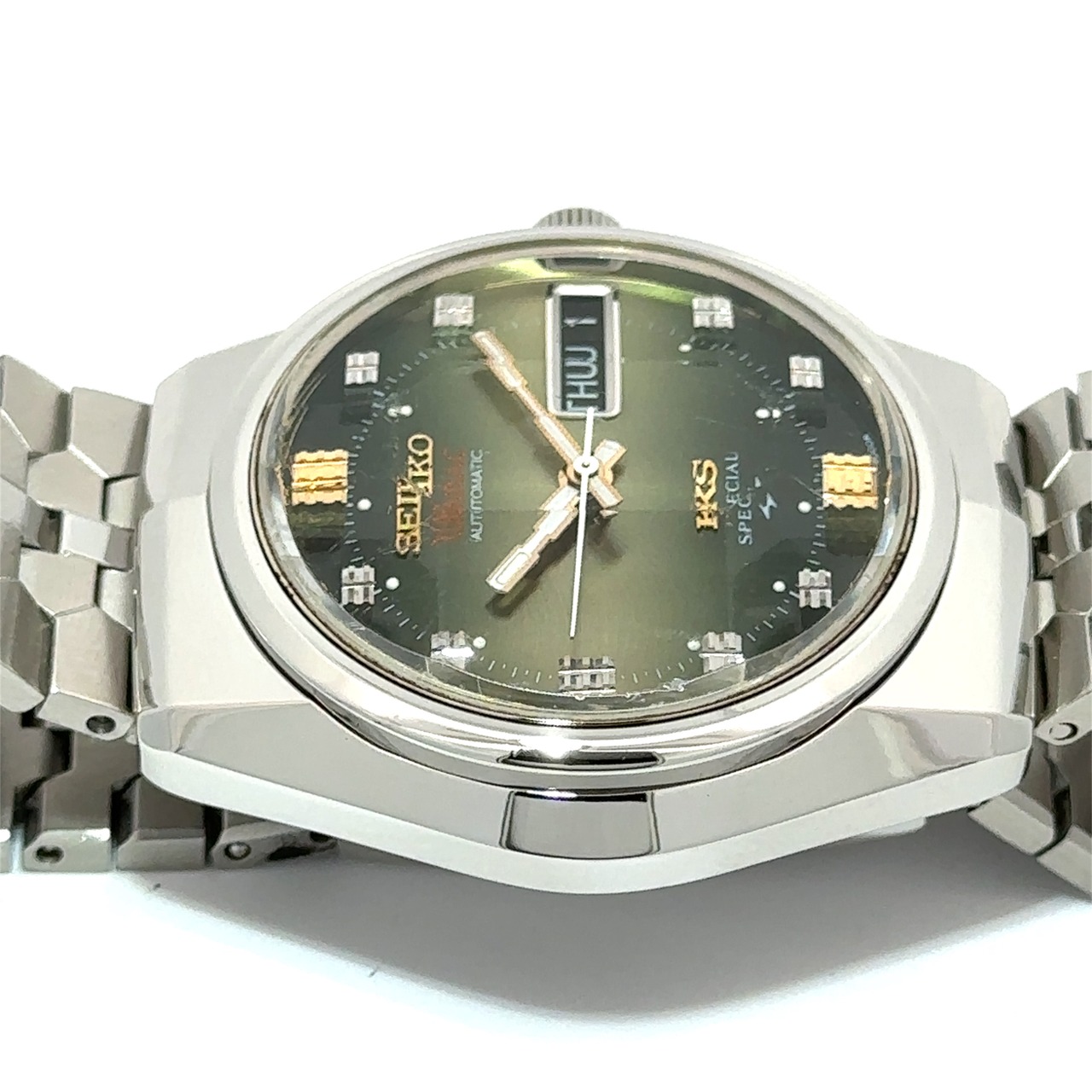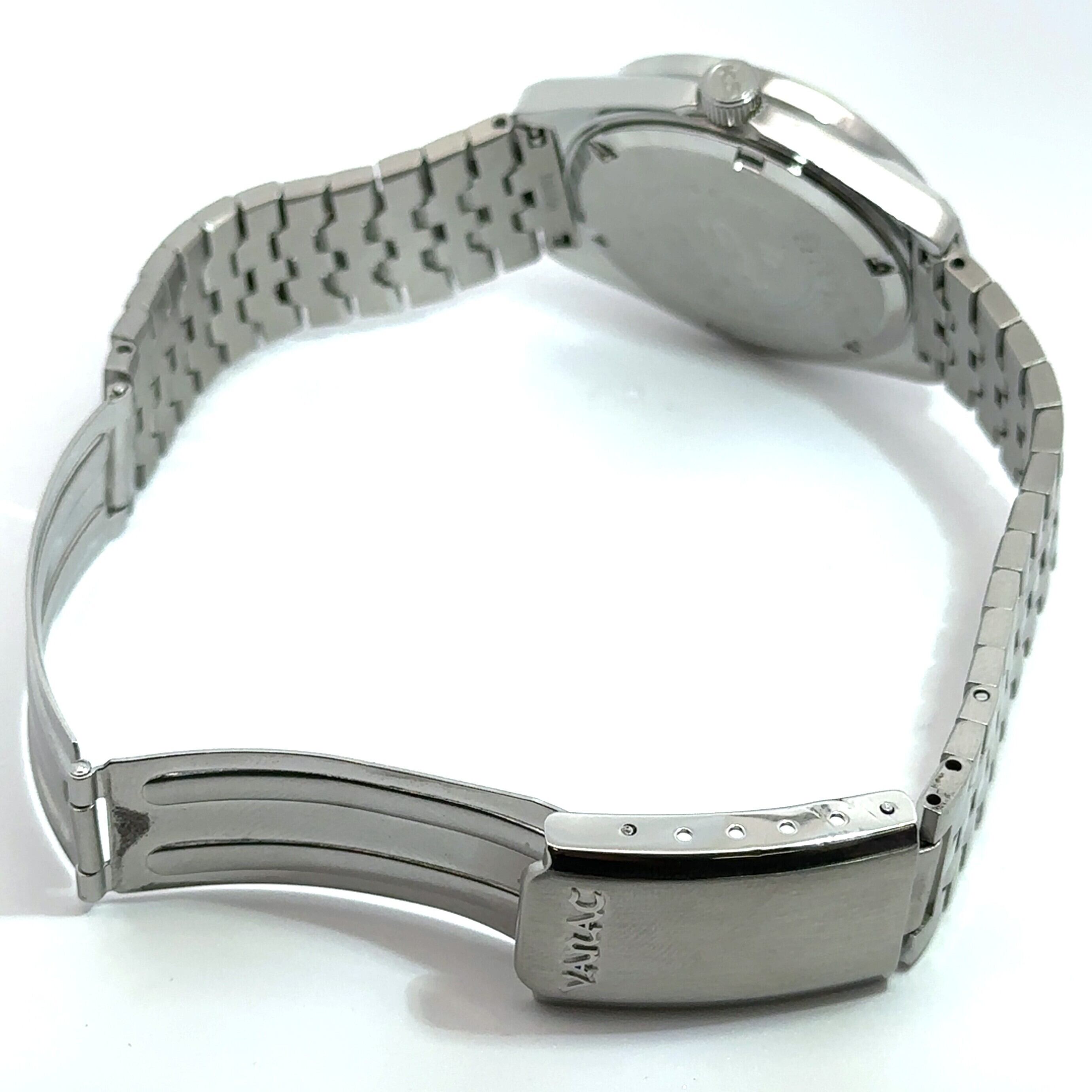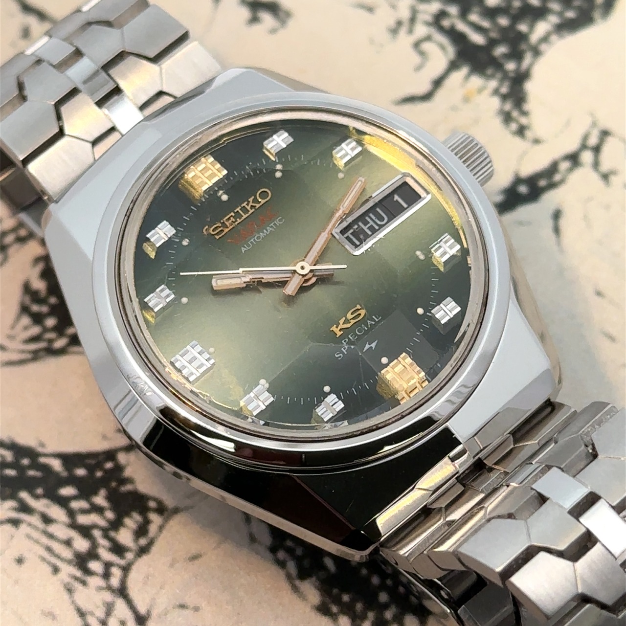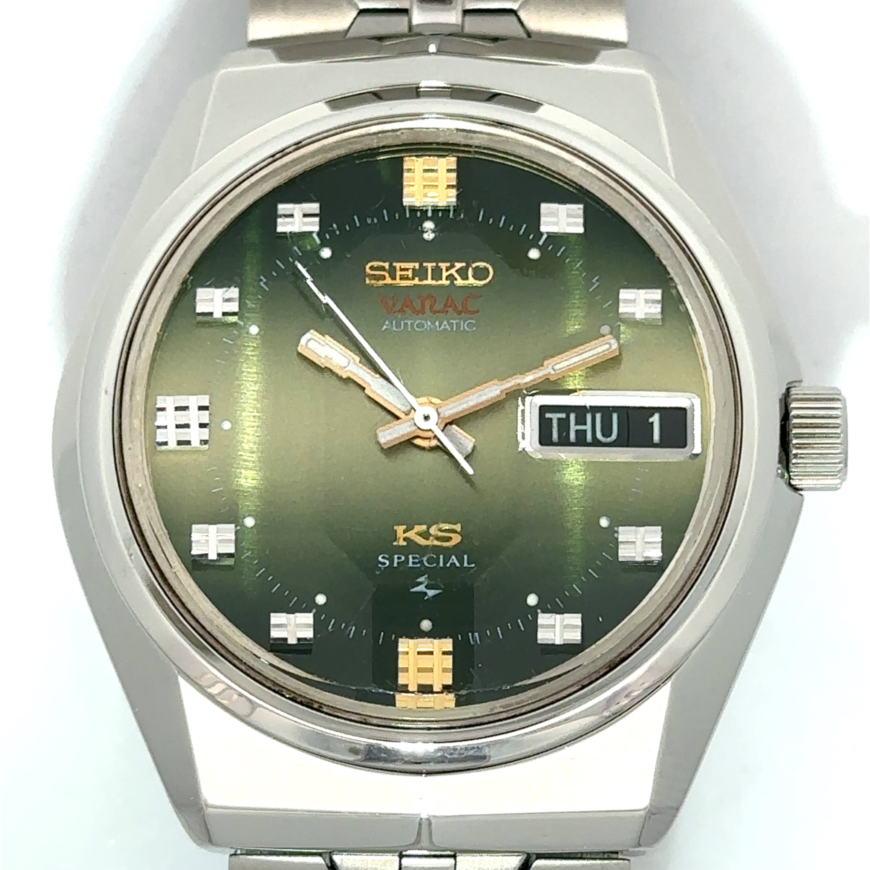 セイコーの名作「キングセイコー」は、1970年代のクラシックな魅力をそのままに、今のスタイルにも自然に馴染む一本です。深みのあるグリーンの文字盤にゴールドのインデックスが輝き、ステンレスのケースとブレスレットが上品な存在感を演出します。曜日と日付表示付きで、アンティークながら実用性も抜群。