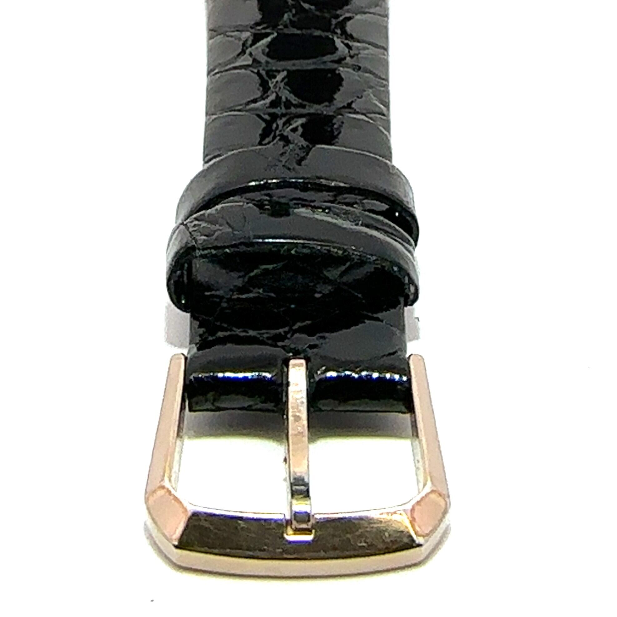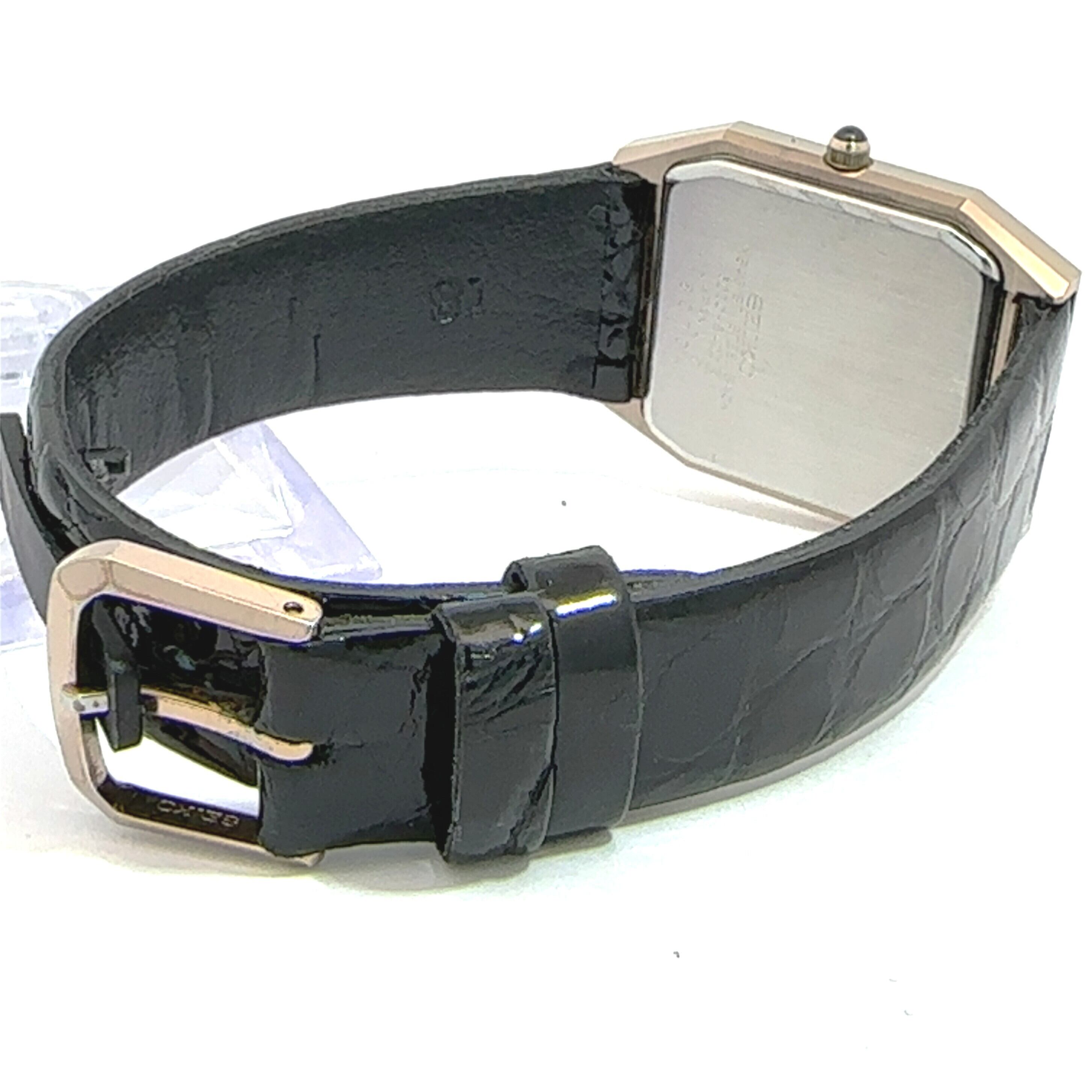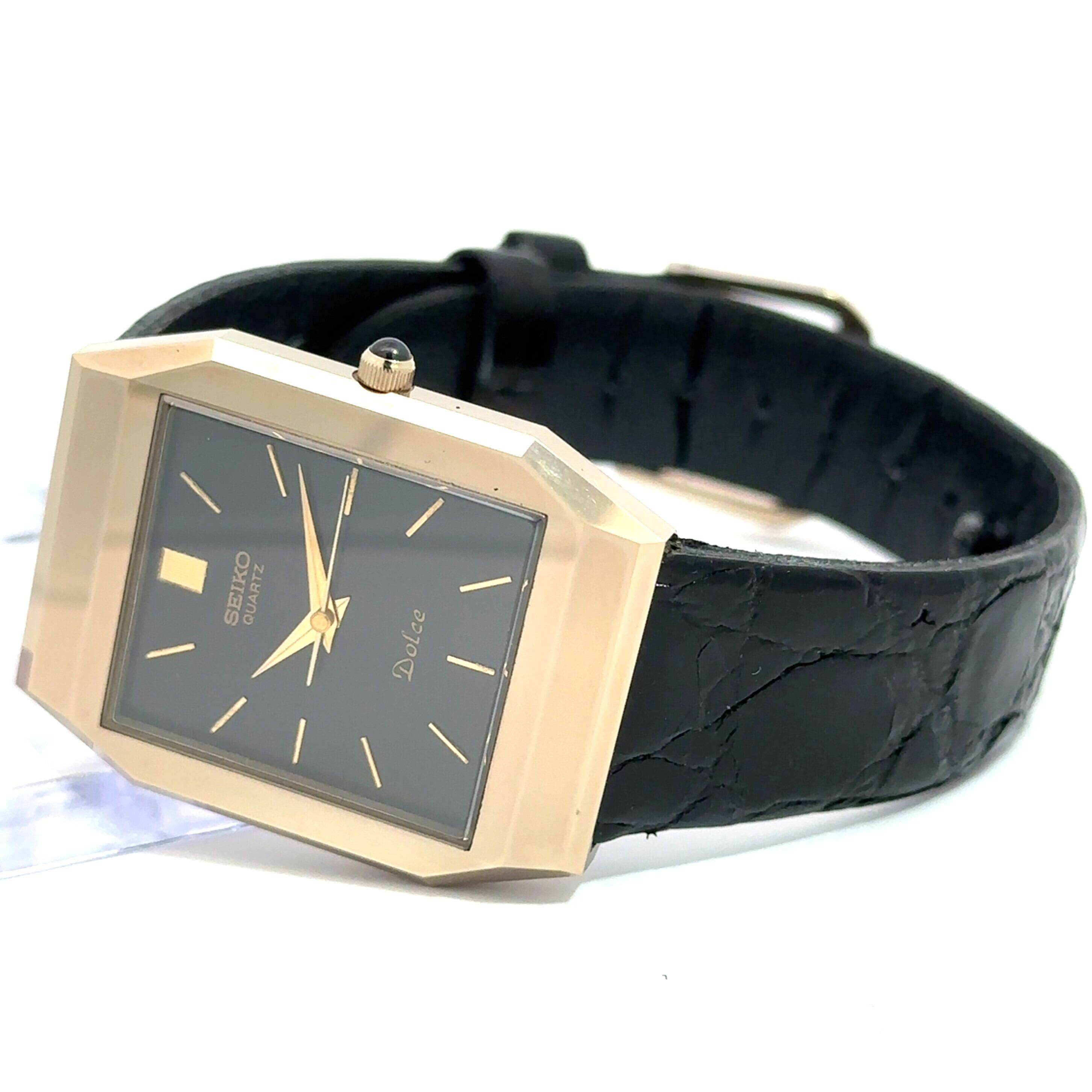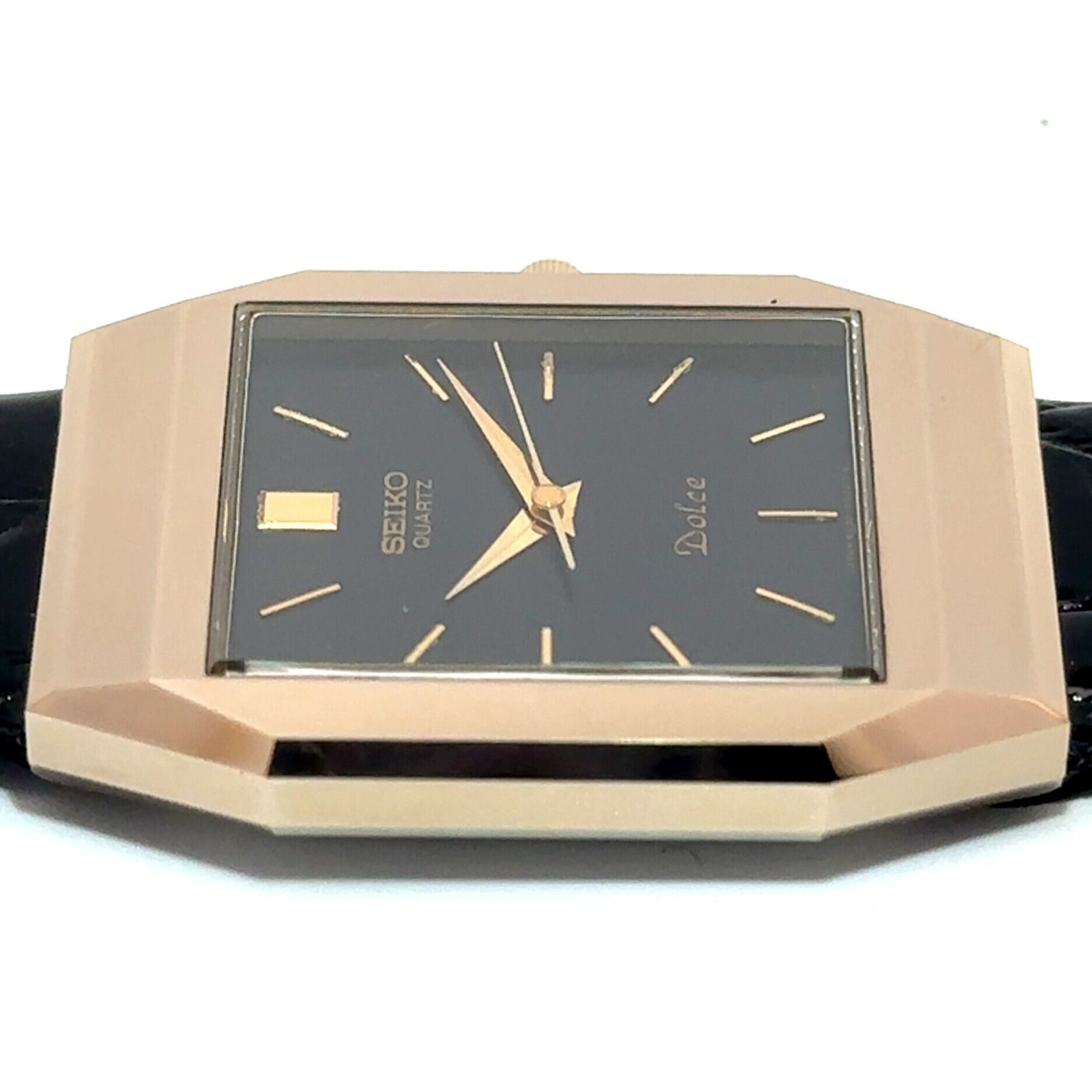 セイコーの「ドルチェ」は、洗練されたデザインと上質な素材で、大人の腕元を美しく彩るシリーズです。こちらのモデルは、エレガントなローズゴールドカラーのケースに、深みのあるブラックダイヤルを組み合わせた一本。直線的なカットが施されたケースは、光を受けるたびに繊細な輝きを放ち、特別感を演出します。ブラックレザーベルトはしっとりとした質感で、クラシックな雰囲気をさらに引き立てます。