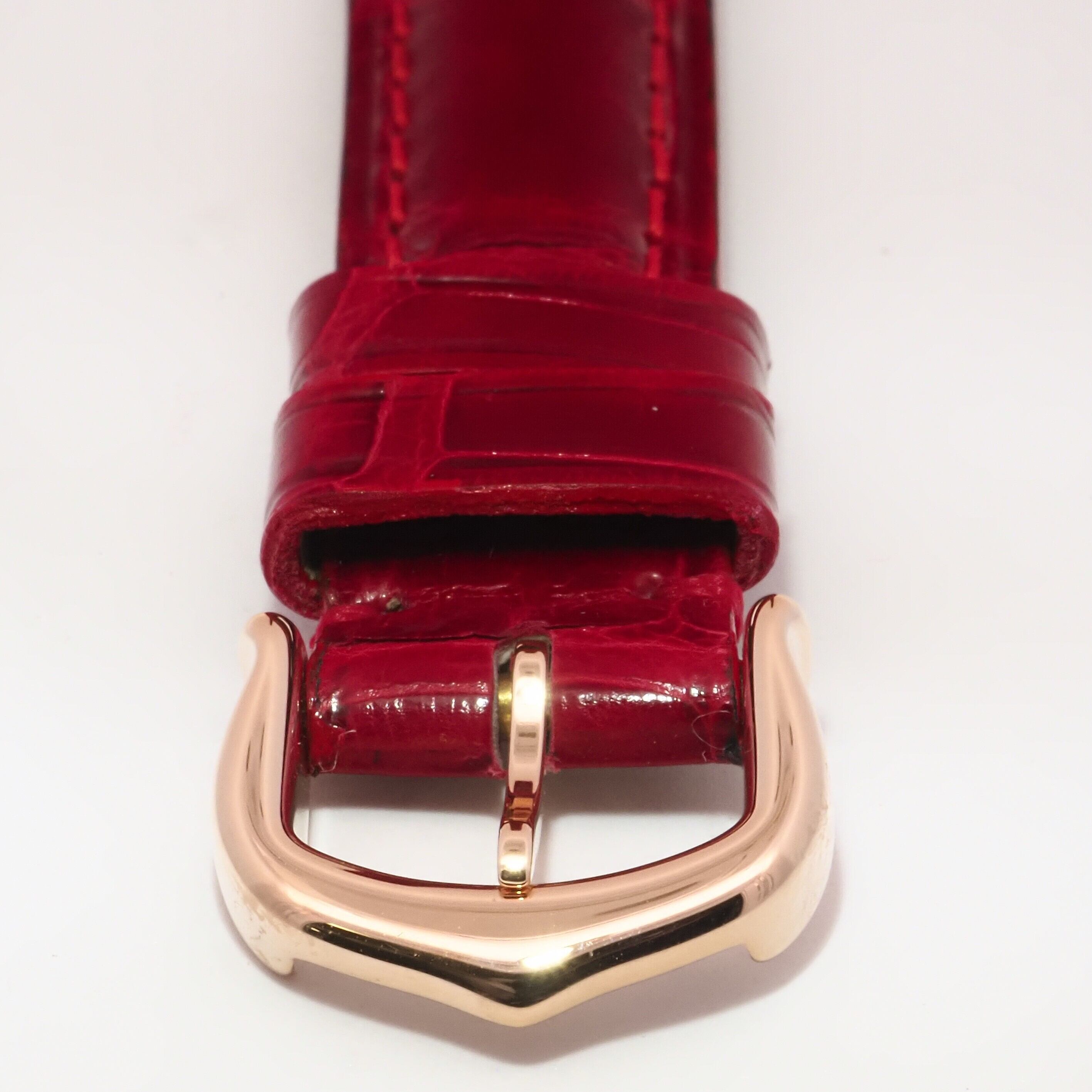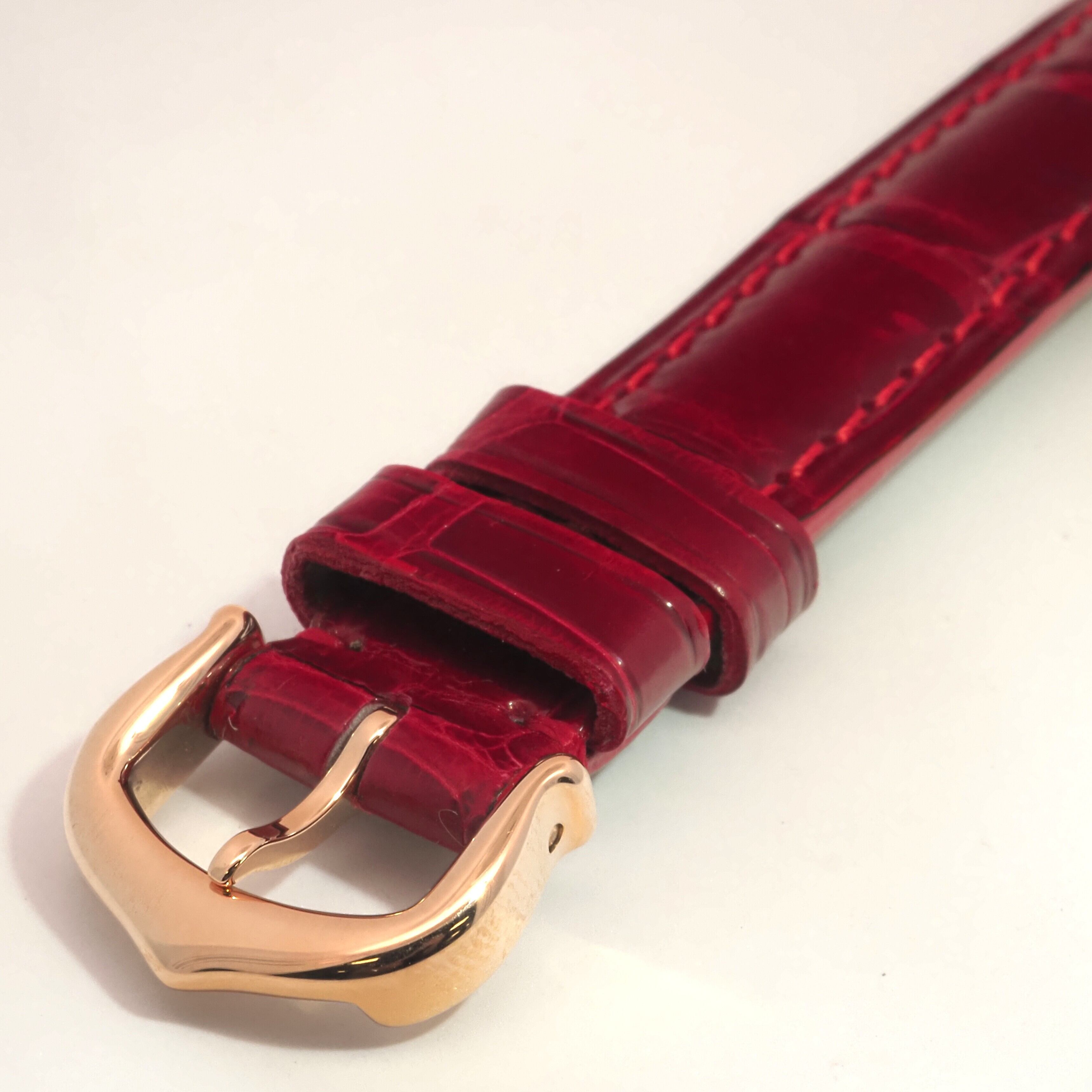 鮮やかなレッドのアリゲーターレザーストラップは、華やかさとエレガンスを兼ね備え、手元に強い存在感を与えます。スーツやドレススタイルにはもちろん、シンプルなコーディネートに合わせても、洗練されたアクセントとして活躍します。