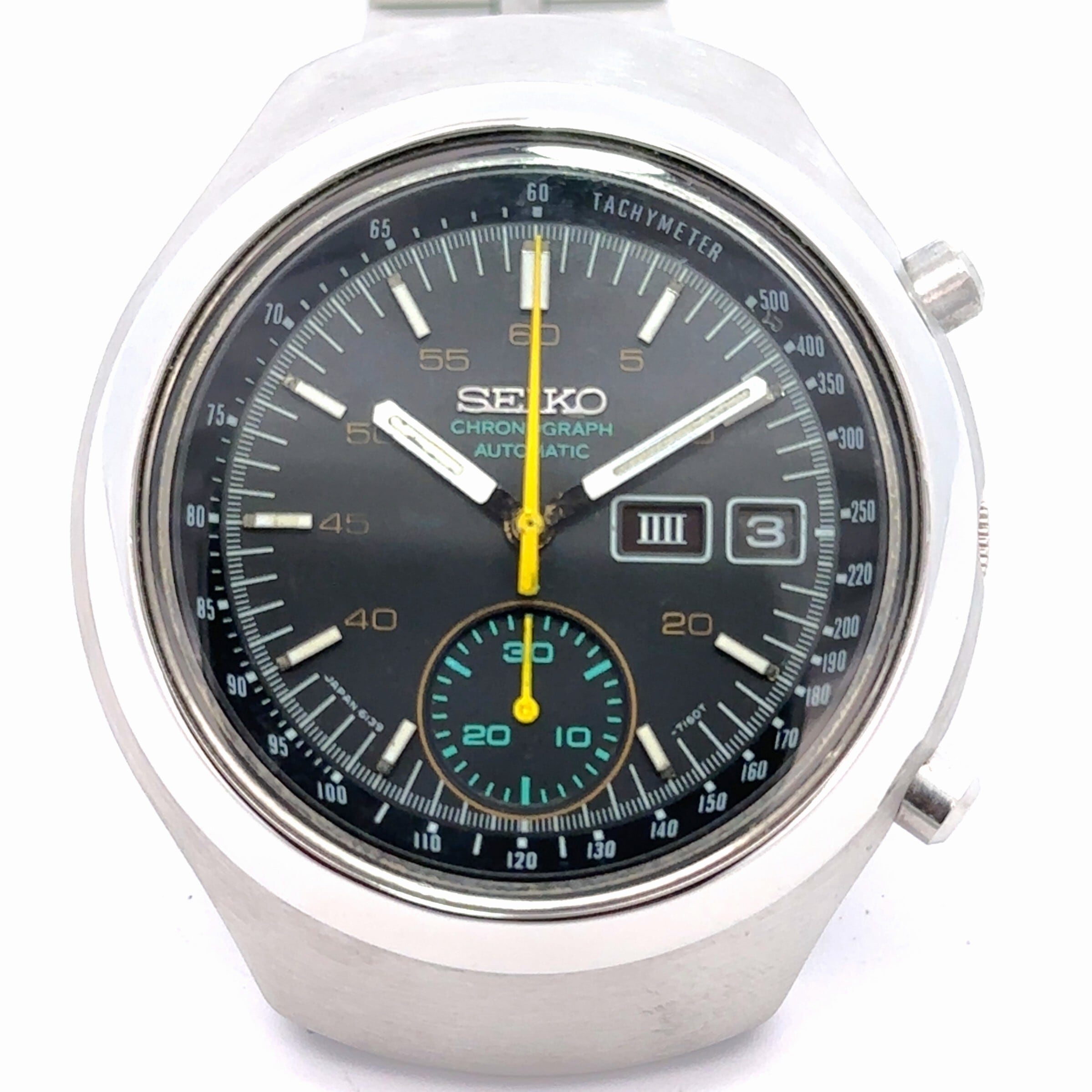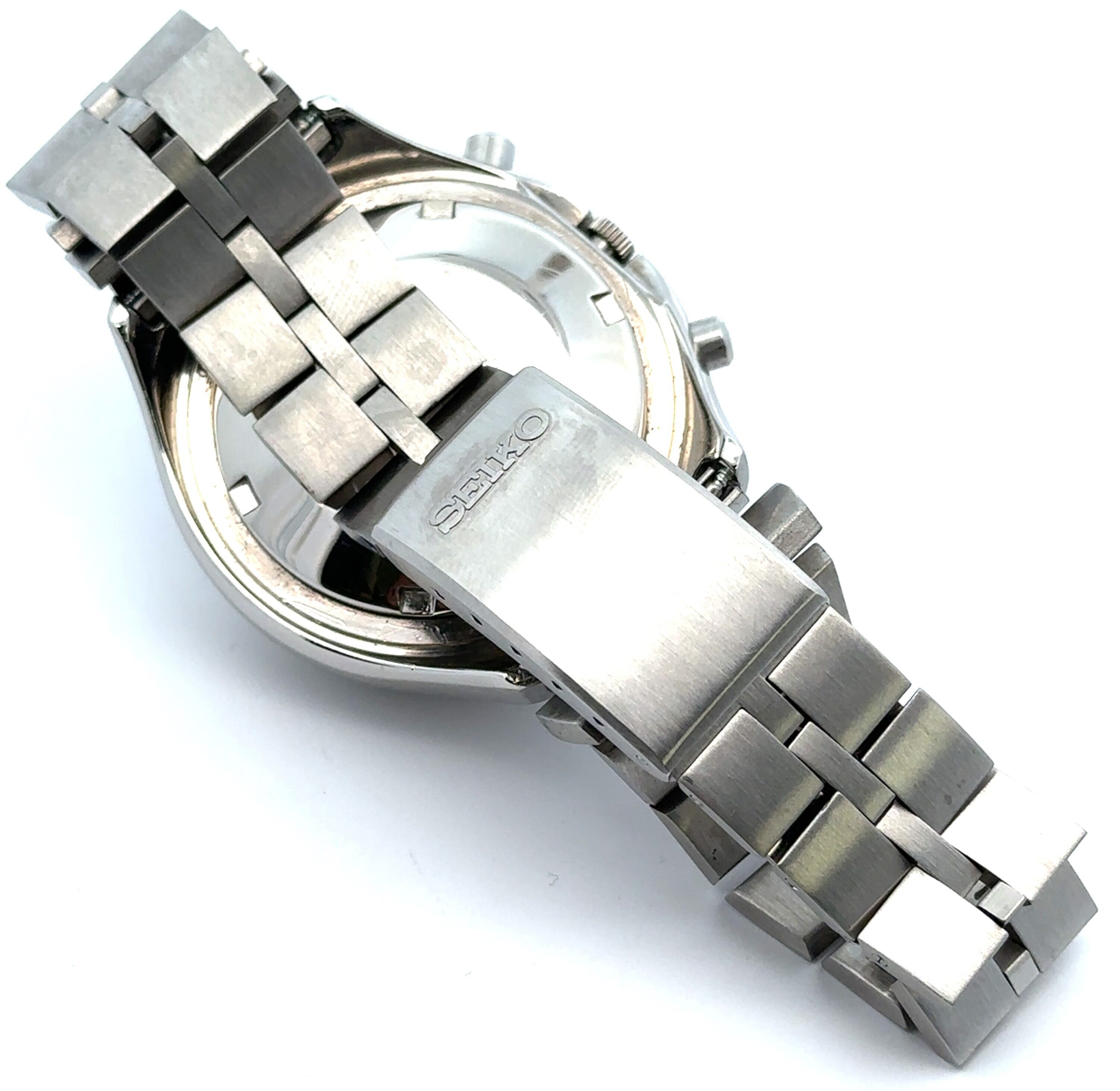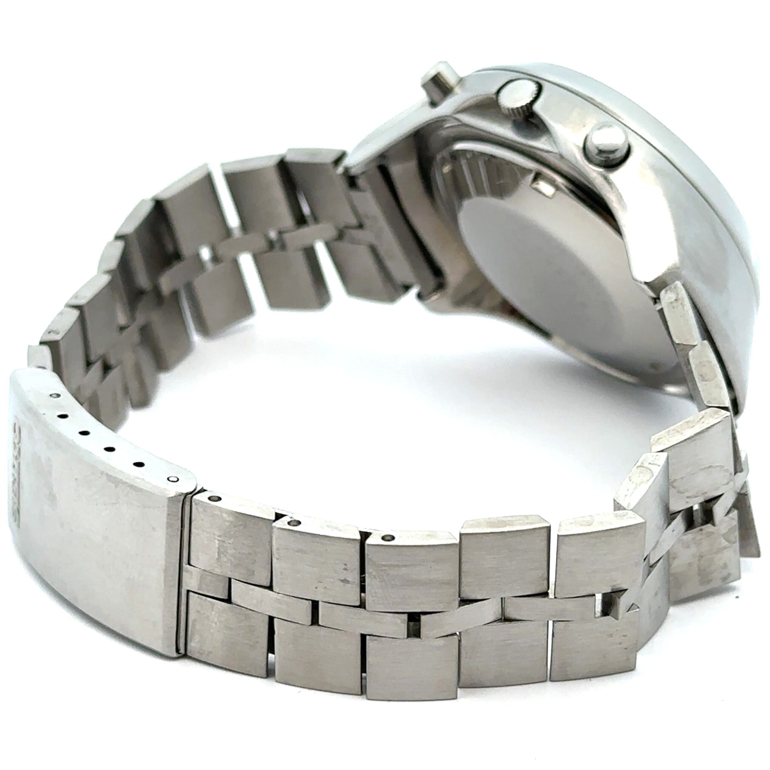 このセイコーのヴィンテージクロノグラフは、黒い文字盤にイエローの針、グリーンのサブダイヤルがアクセントになった、どこかレトロで遊び心のある一本です。丸みのあるケースデザインも昔のセイコーらしい雰囲気があって、普段のスタイルに“ちょっと渋い味”を足してくれます。自動巻きなので電池交換いらずで、普段つけているだけで動いてくれるのも嬉しいポイント。ステンレスブレスレットは使いやすく、アンティーク時計が初めての方でも気軽に楽しめます。