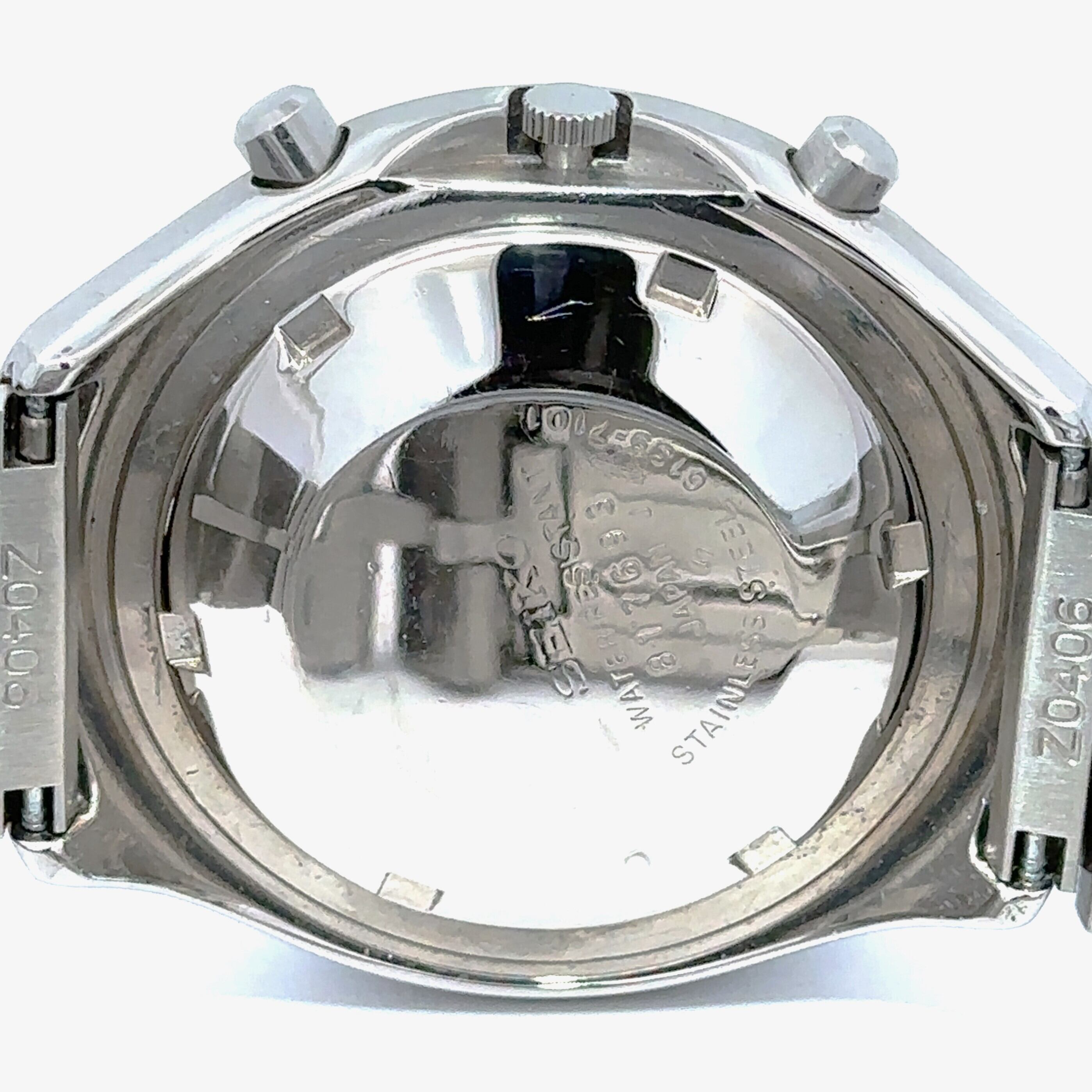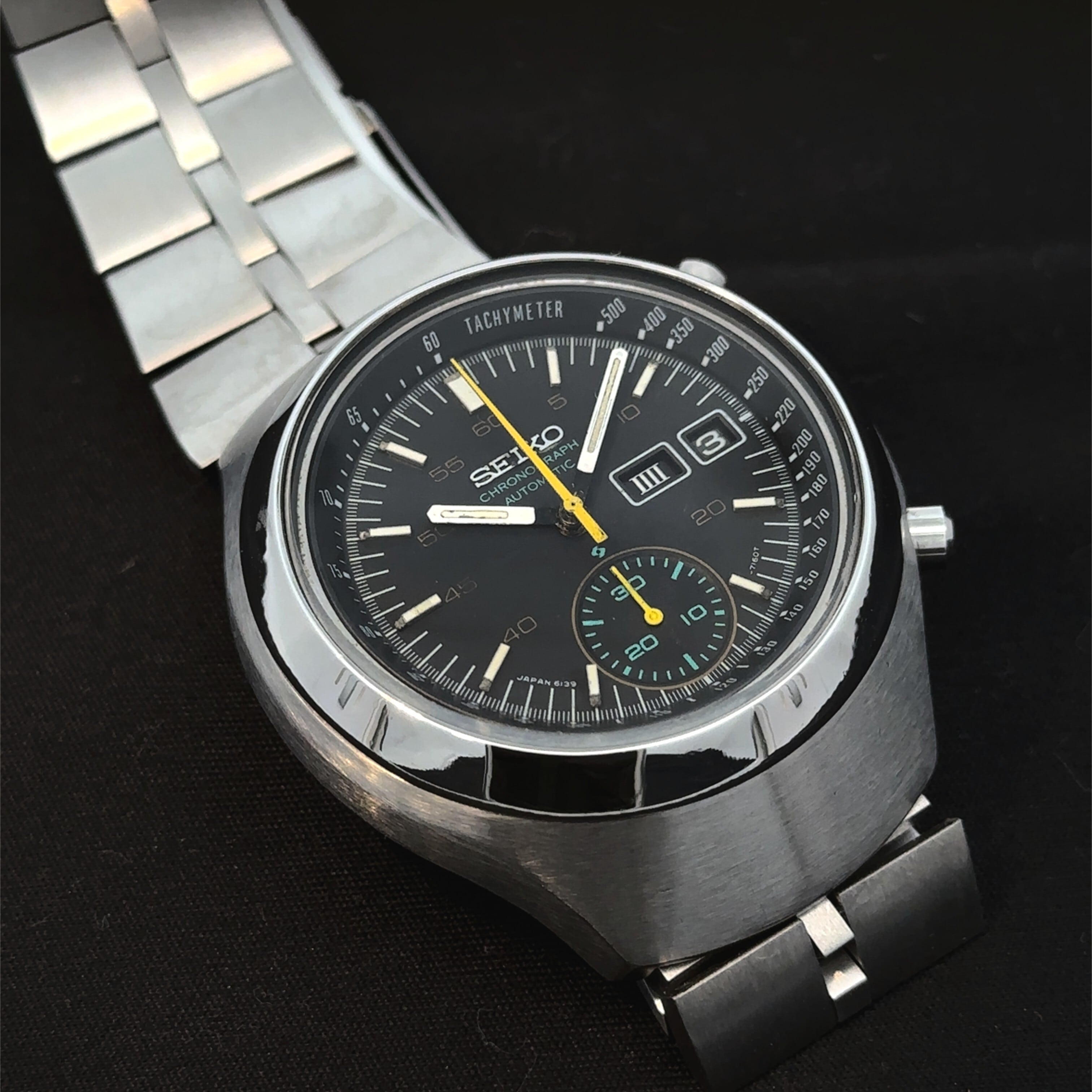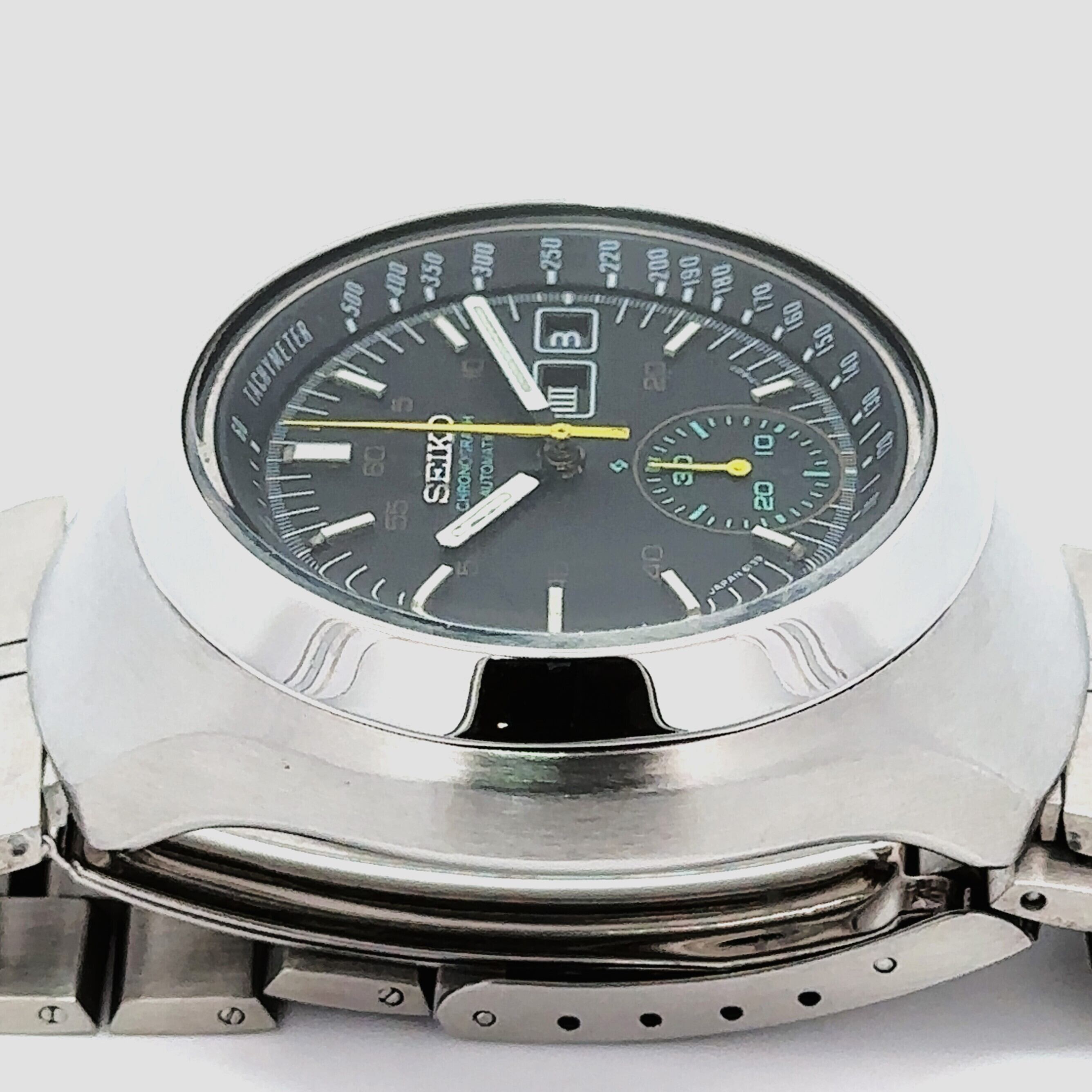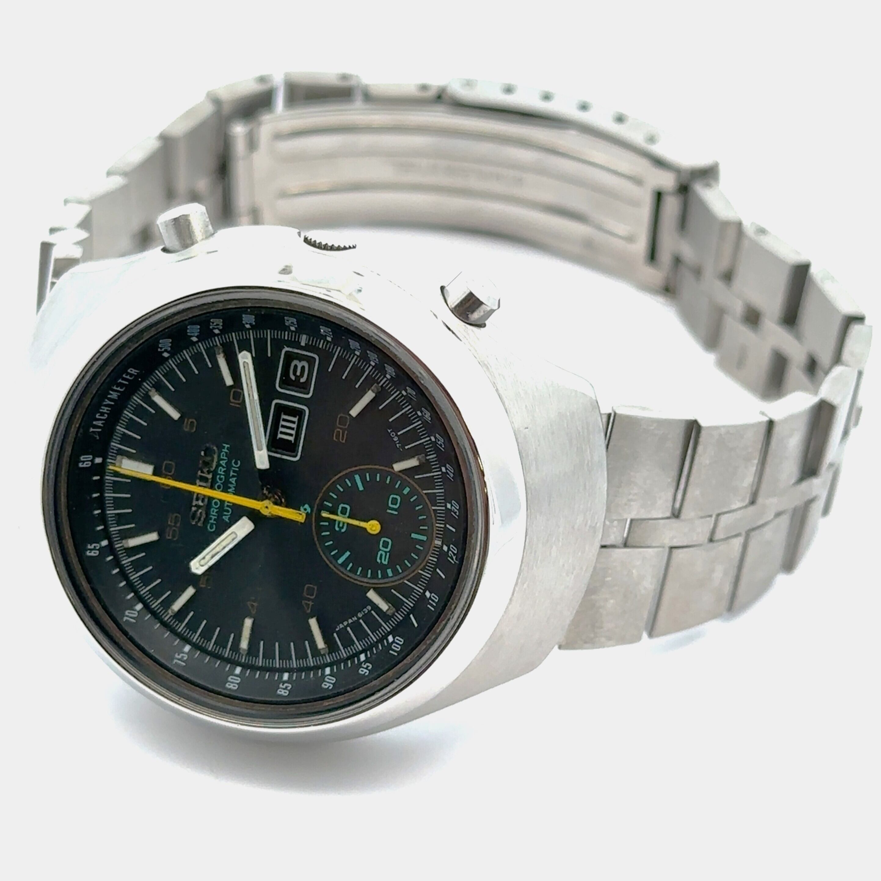このセイコーのヴィンテージクロノグラフは、黒い文字盤にイエローの針、グリーンのサブダイヤルがアクセントになった、どこかレトロで遊び心のある一本です。丸みのあるケースデザインも昔のセイコーらしい雰囲気があって、普段のスタイルに“ちょっと渋い味”を足してくれます。自動巻きなので電池交換いらずで、普段つけているだけで動いてくれるのも嬉しいポイント。ステンレスブレスレットは使いやすく、アンティーク時計が初めての方でも気軽に楽しめます。