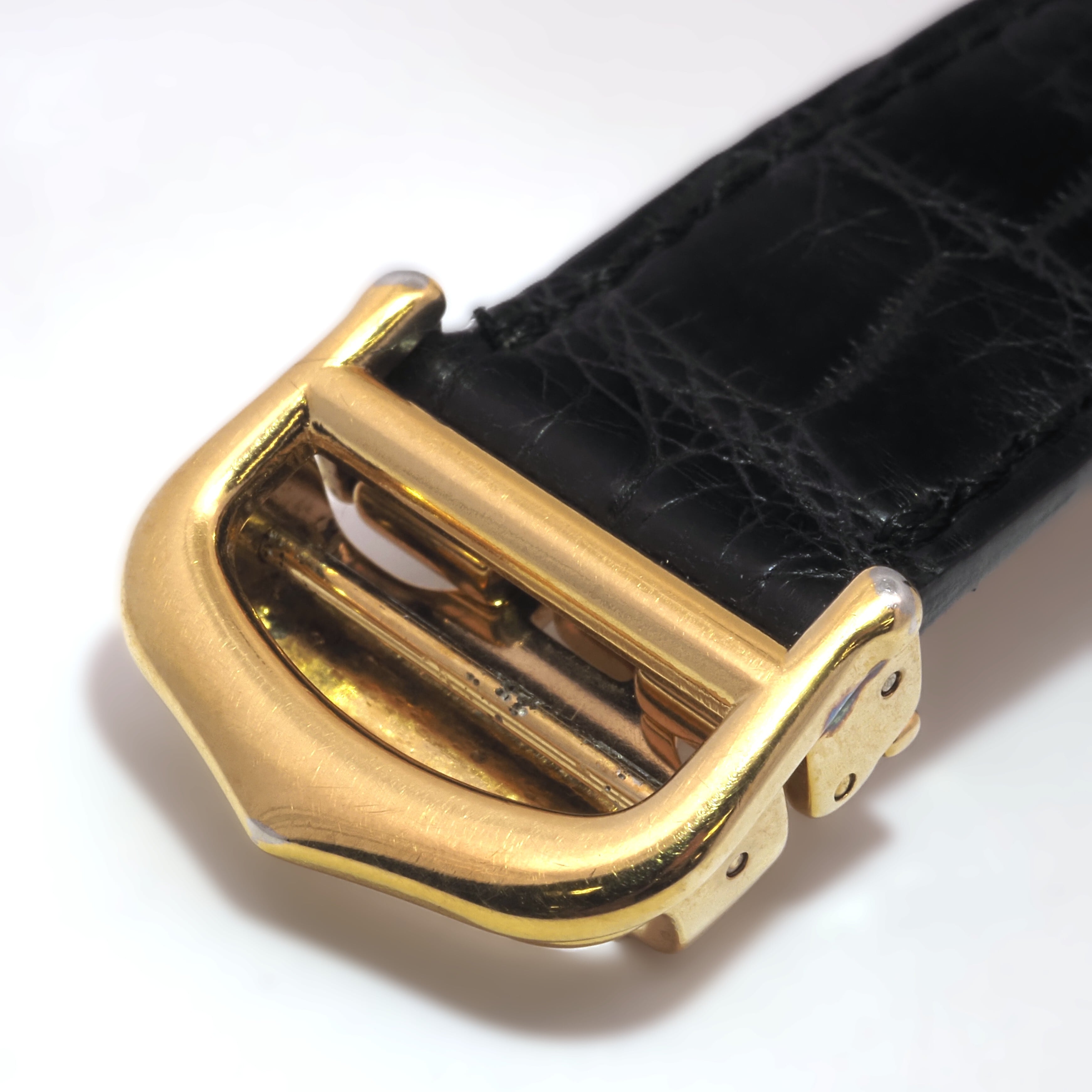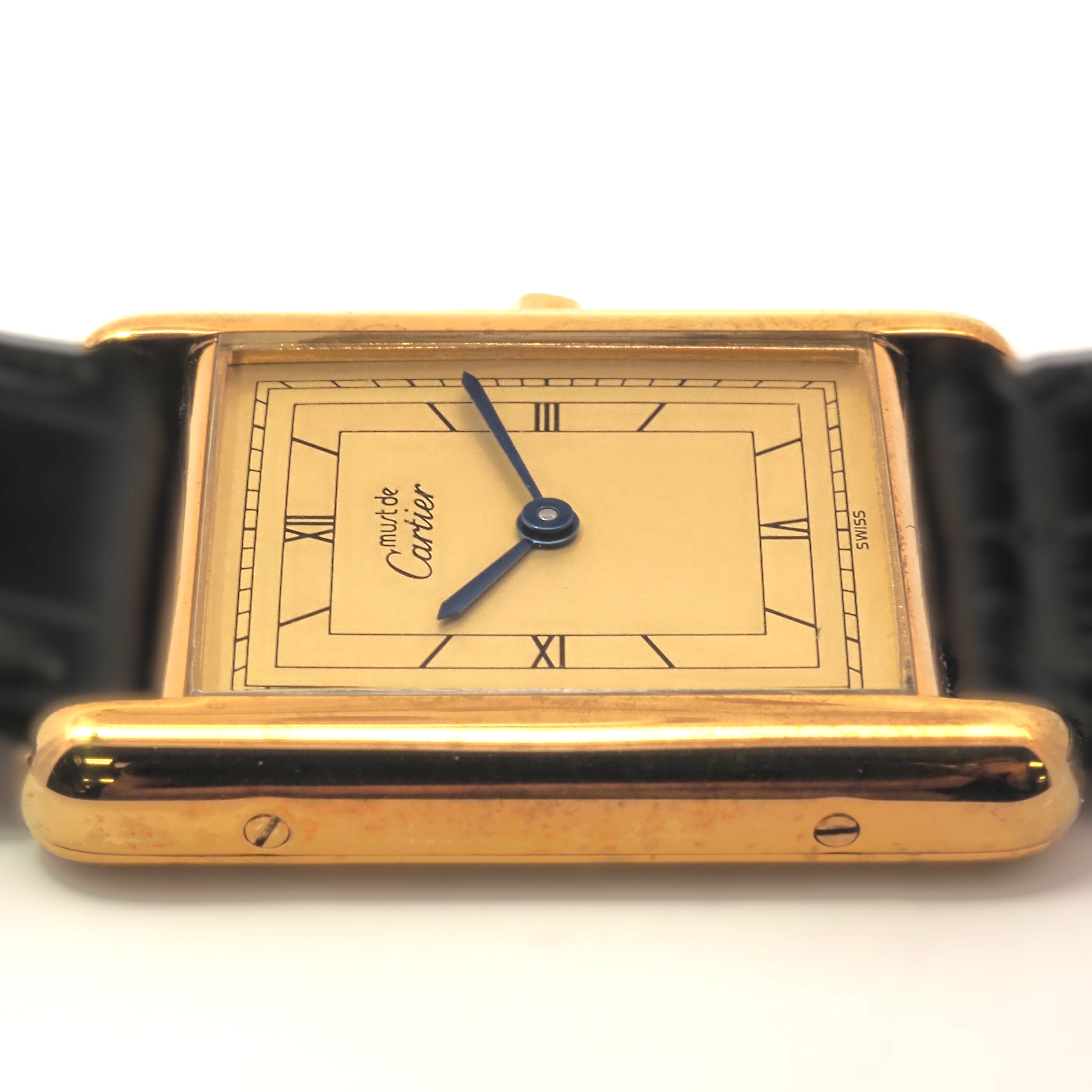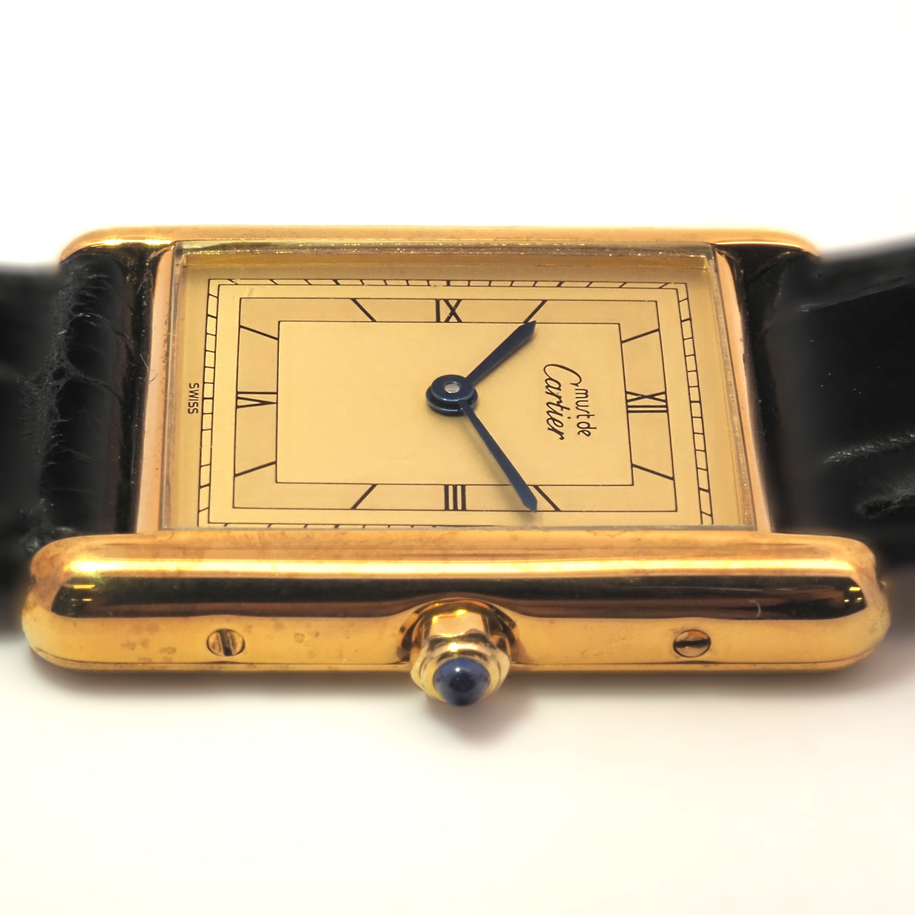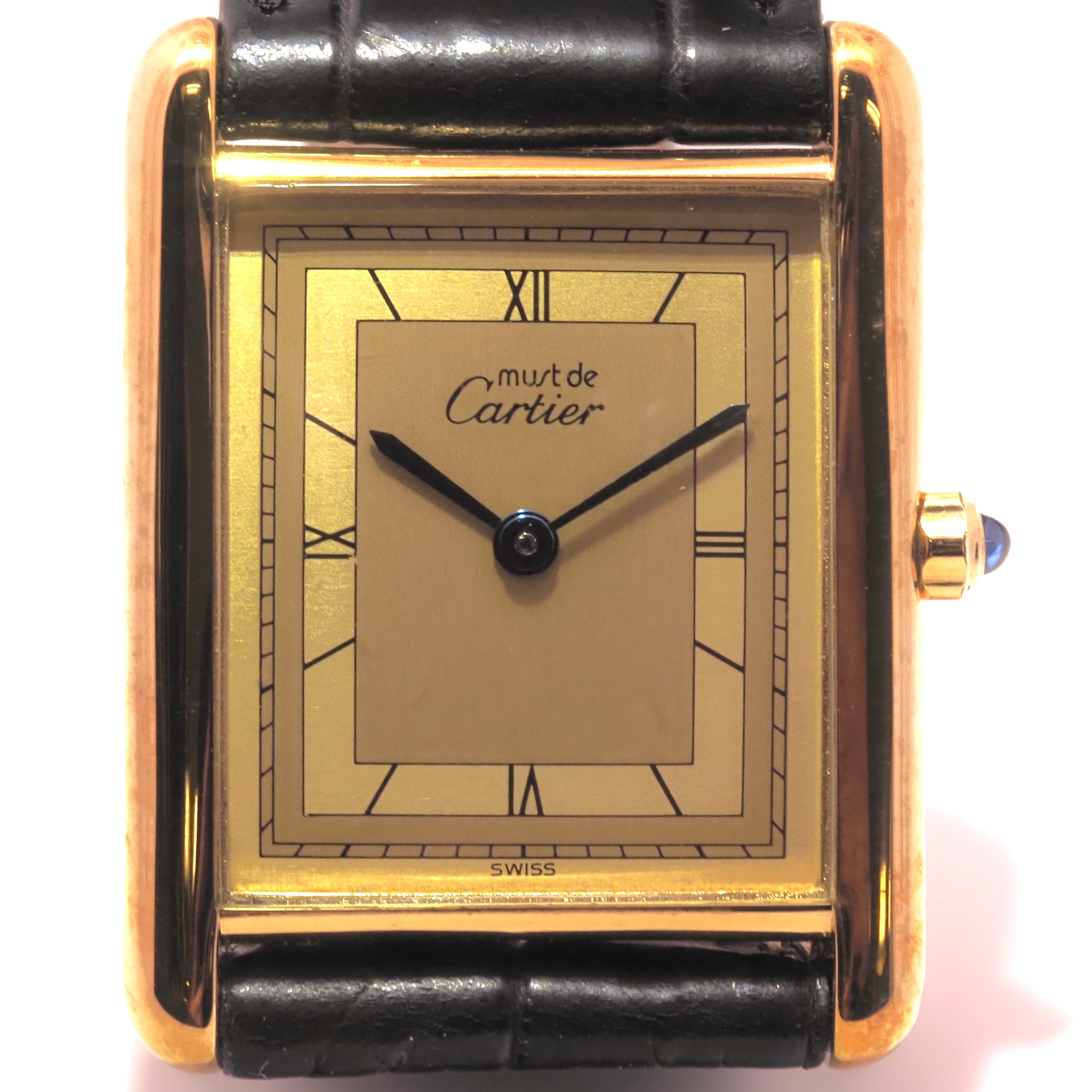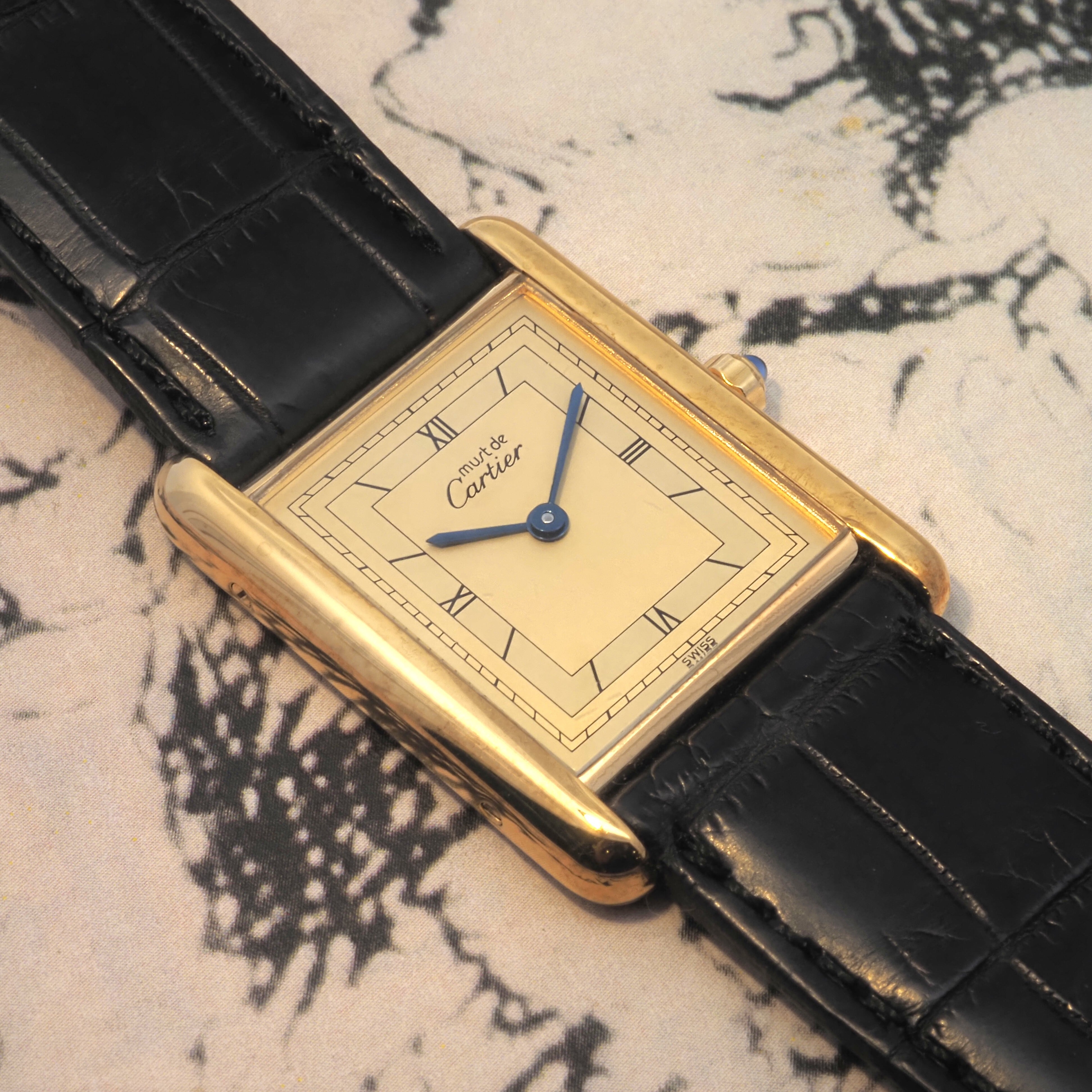 カルティエを代表する「タンク」シリーズの中でも、やわらかい雰囲気と上品さを兼ね備えたのがこの《マストタンク》。四角いケースにローマン数字の文字盤、そしてカルティエらしい青い針とカボションリューズがアクセントになっていて、手元をさりげなく華やかにしてくれる時計です。ゴールドカラーのケースとブラックレザーのベルトの組み合わせもとても上品で、アンティークならではの味わいも楽しめます。