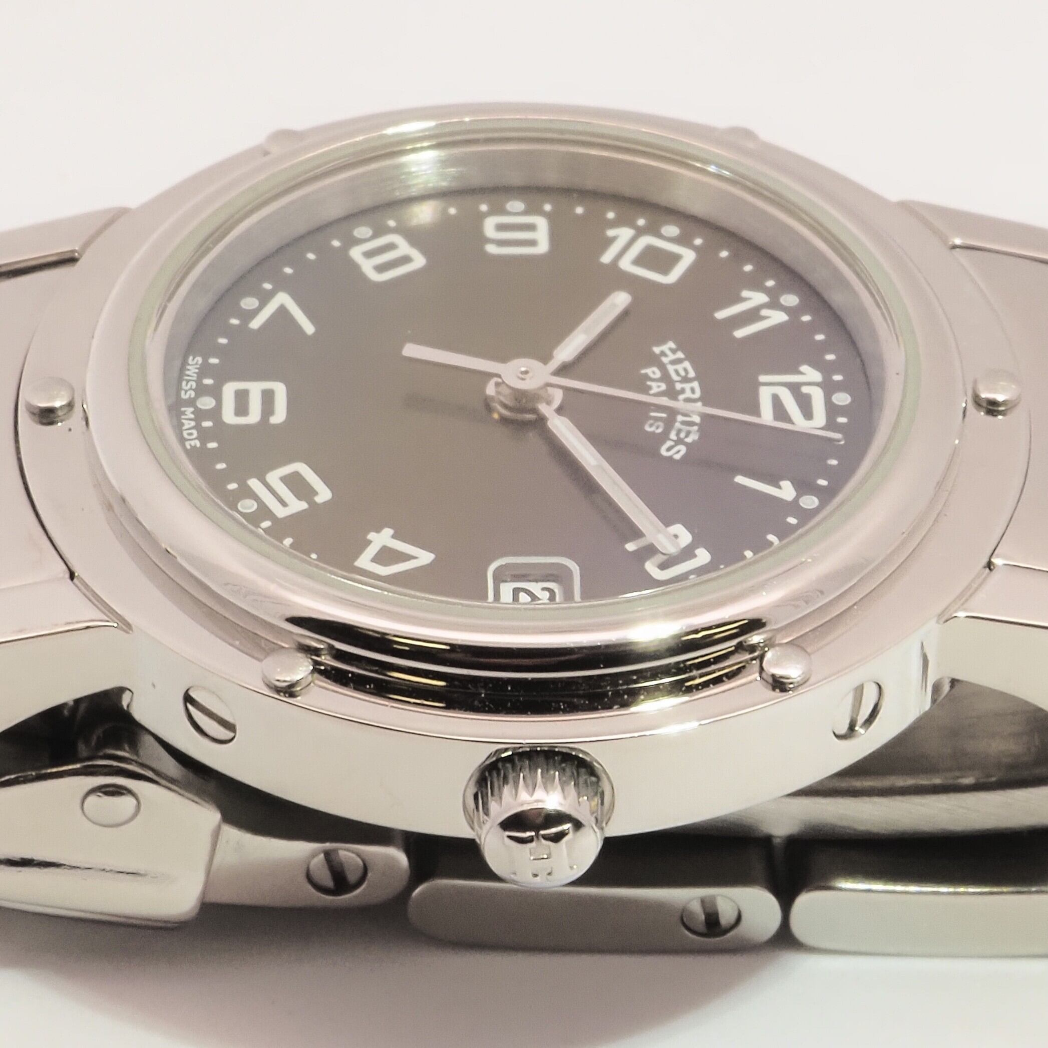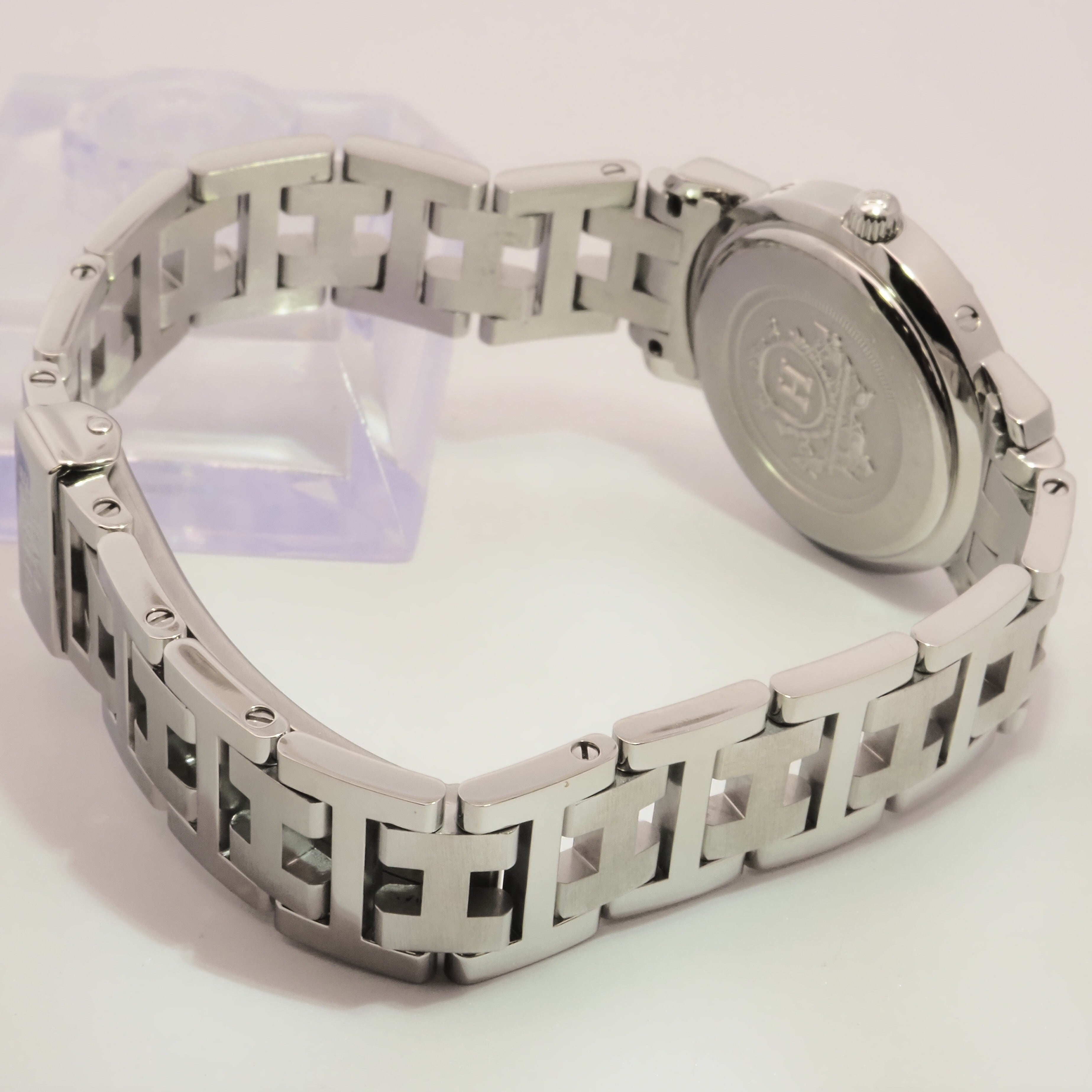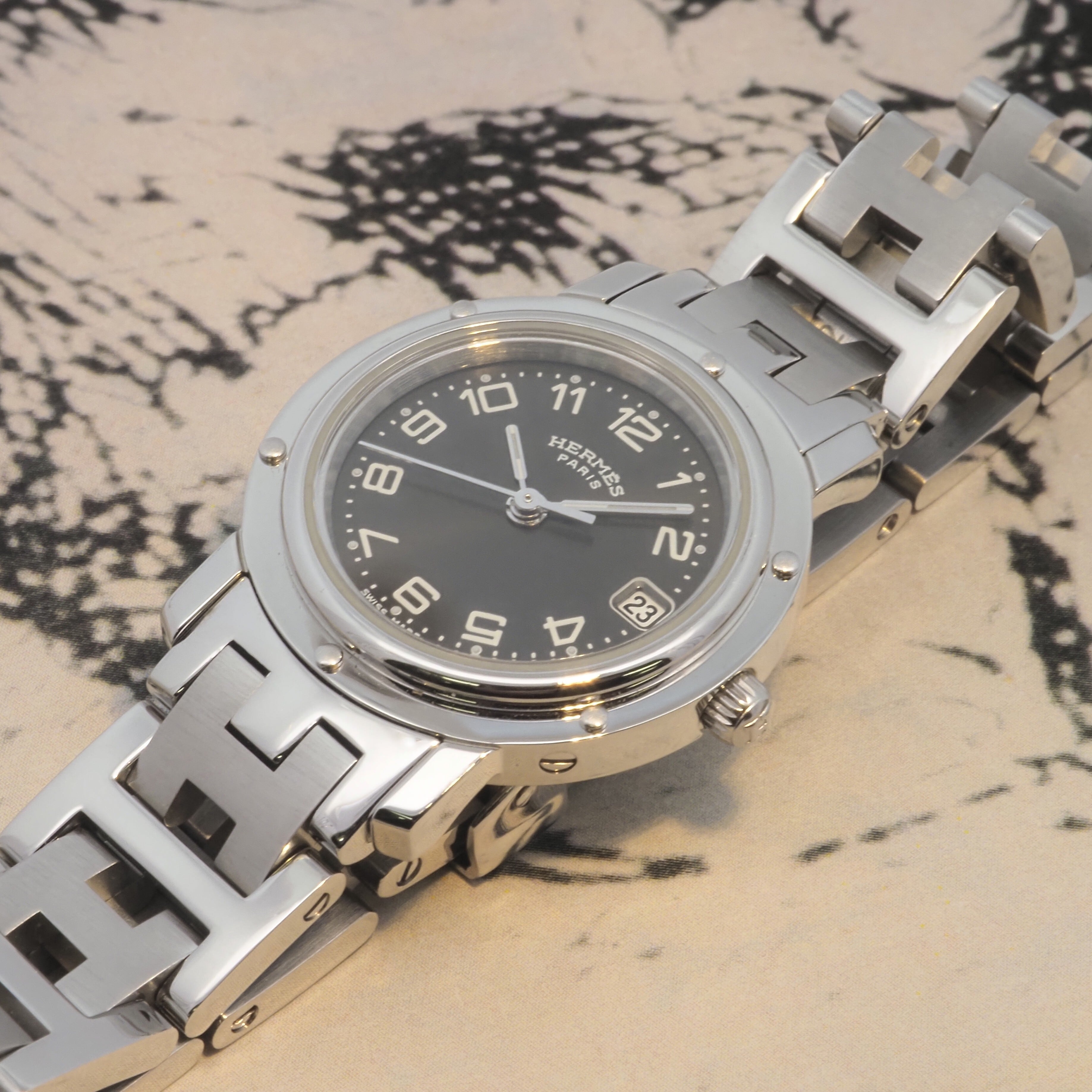エルメスの《クリッパー》は、丸いケースと“H”モチーフのブレスレットが特徴の、上品で使いやすい腕時計です。こちらのモデルはブラック文字盤が全体をすっきり引き締めてくれて、シルバーのステンレスブレスと合わせることで、ほどよく大人っぽい雰囲気を楽しめます。数字のインデックスが見やすく、デイト表示も付いているので、普段使いにもとても便利です。