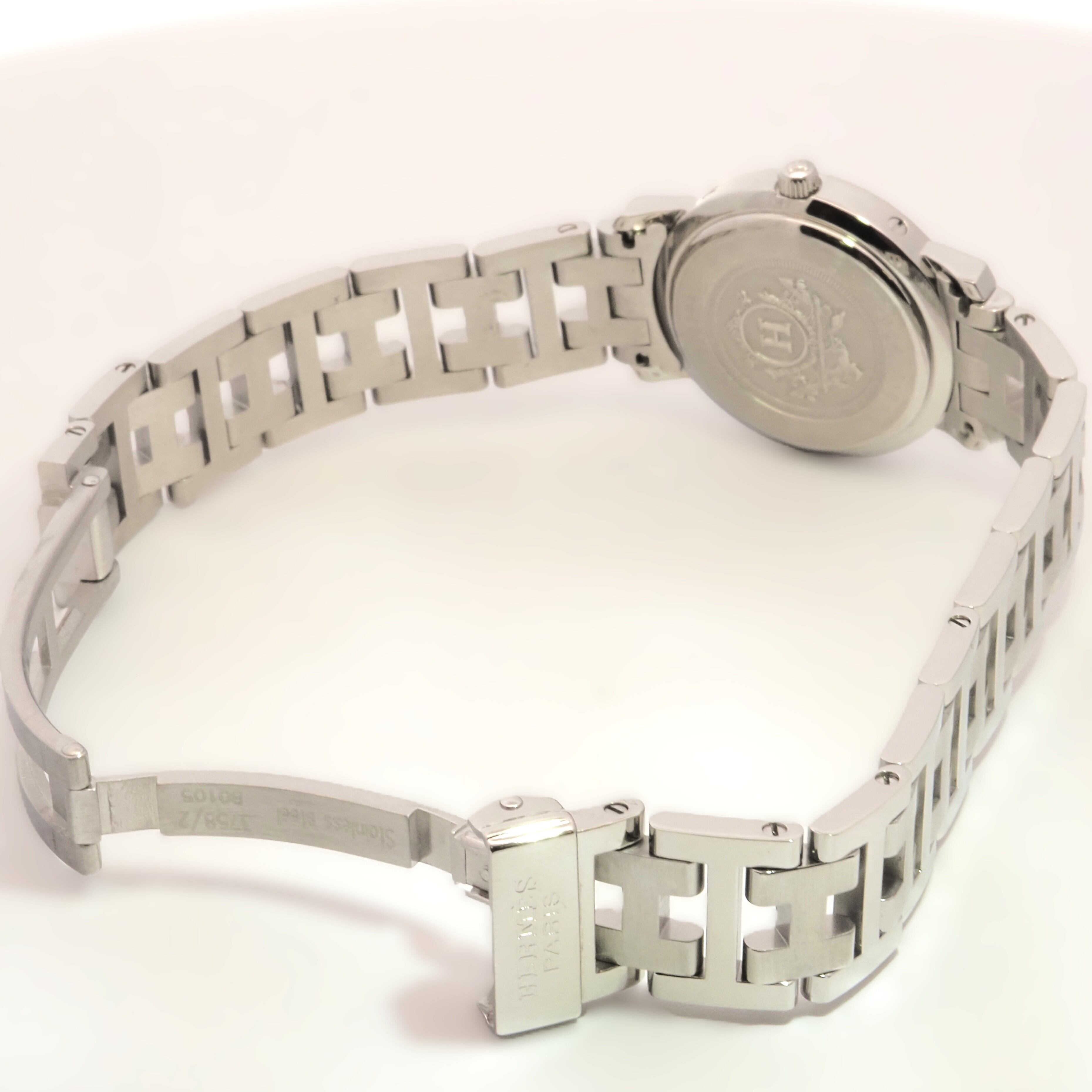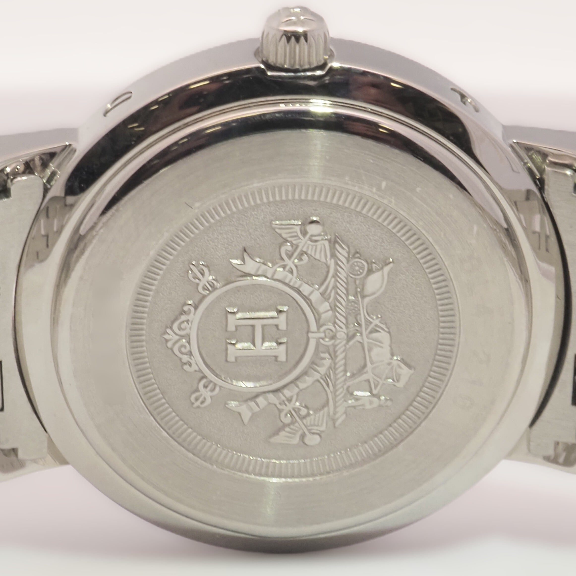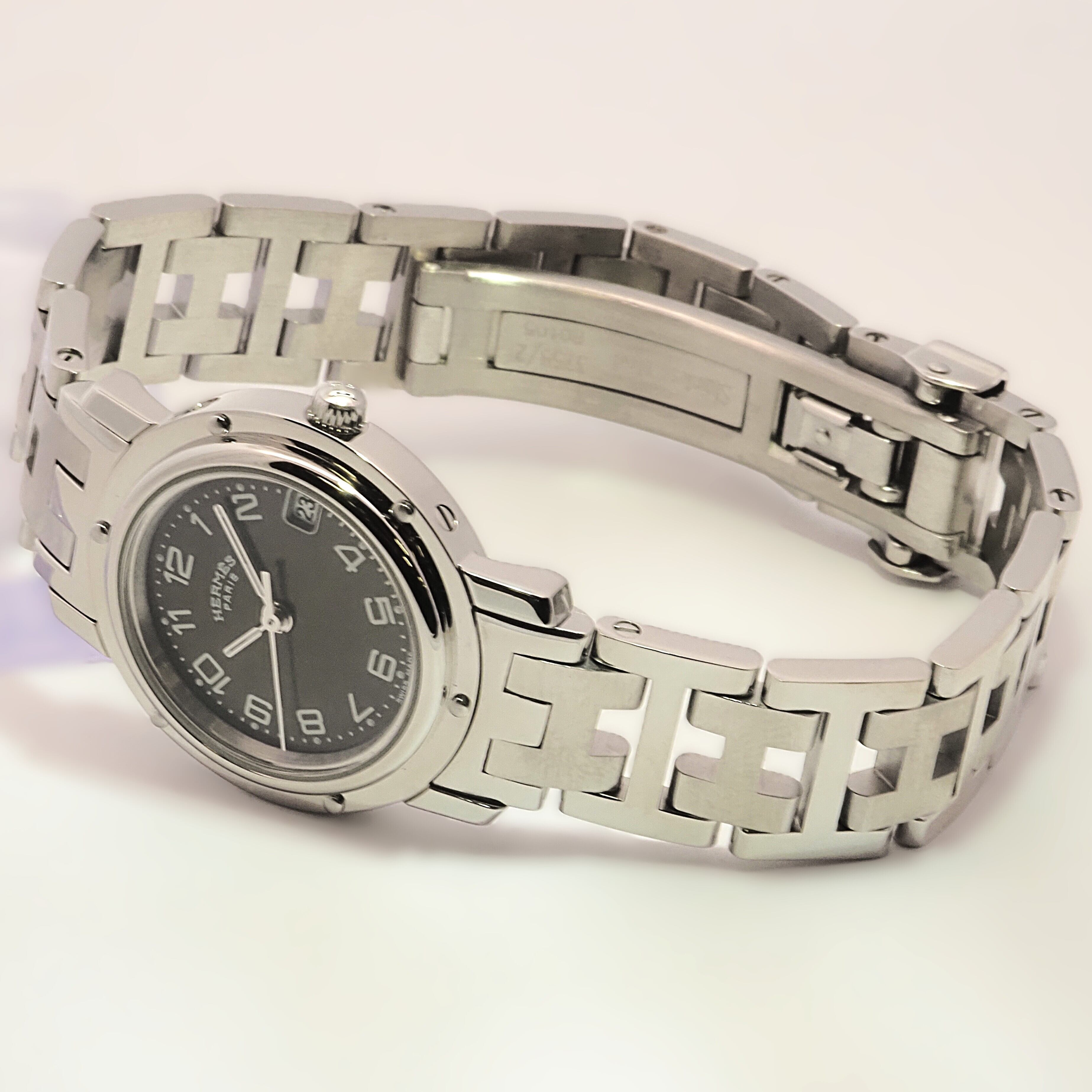 エルメスの《クリッパー》は、丸いケースと“H”モチーフのブレスレットが特徴の、上品で使いやすい腕時計です。こちらのモデルはブラック文字盤が全体をすっきり引き締めてくれて、シルバーのステンレスブレスと合わせることで、ほどよく大人っぽい雰囲気を楽しめます。数字のインデックスが見やすく、デイト表示も付いているので、普段使いにもとても便利です。