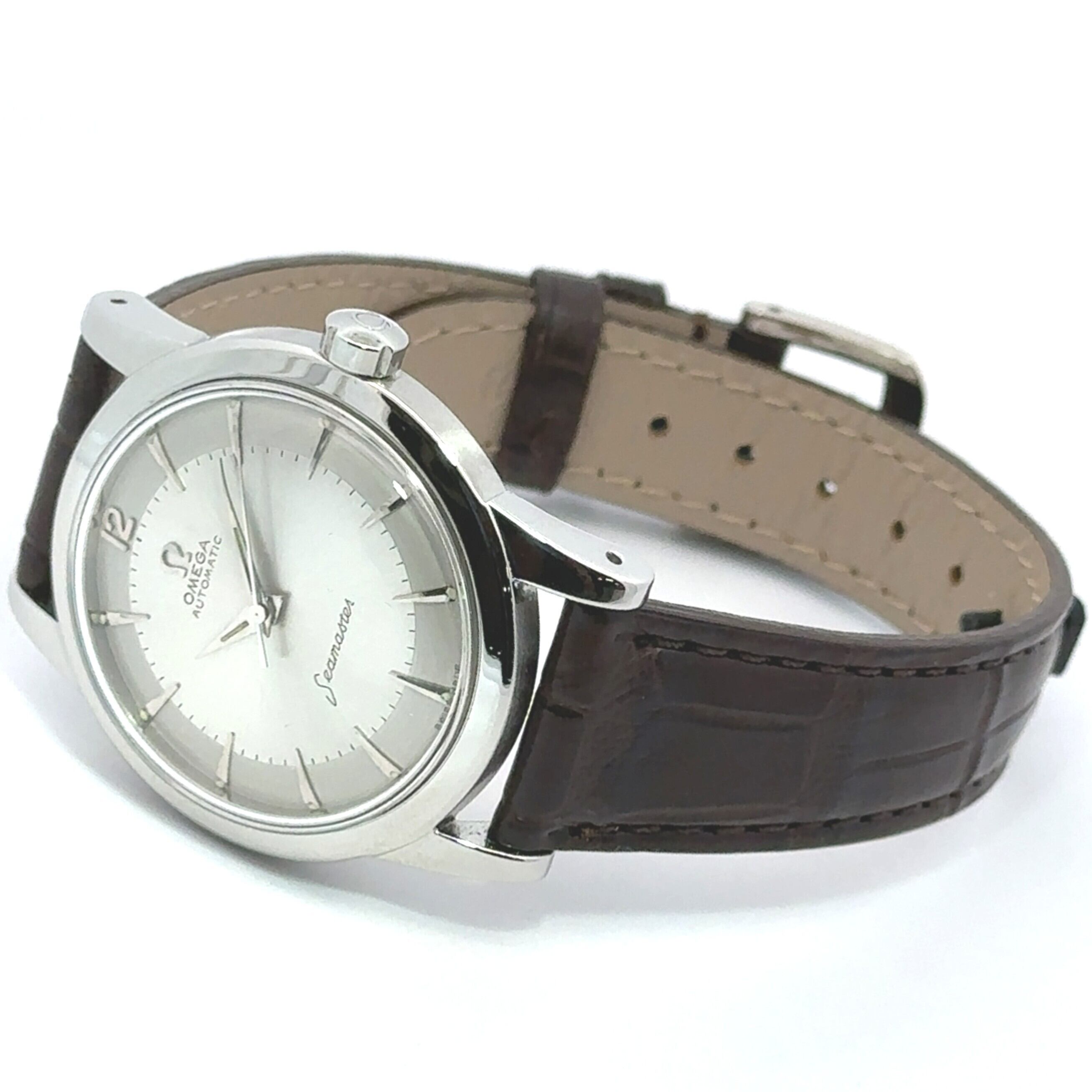 オメガ《シーマスター》 こちらのモデルは、端正なシルバー文字盤と、滑らかな光沢を湛えたラウンドケースが美しく調和した、まさに“クラシックエレガンス”を体現する一本です。丁寧に配置されたインデックスと繊細な針が作り出すバランスは、控えめでありながら確かな高級感を漂わせ、腕元を見るたびにその美しさを静かに実感させてくれます。