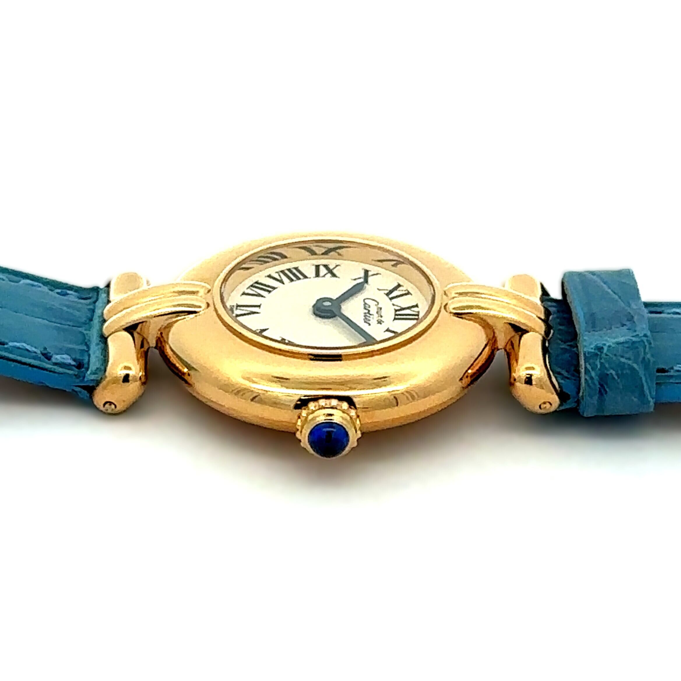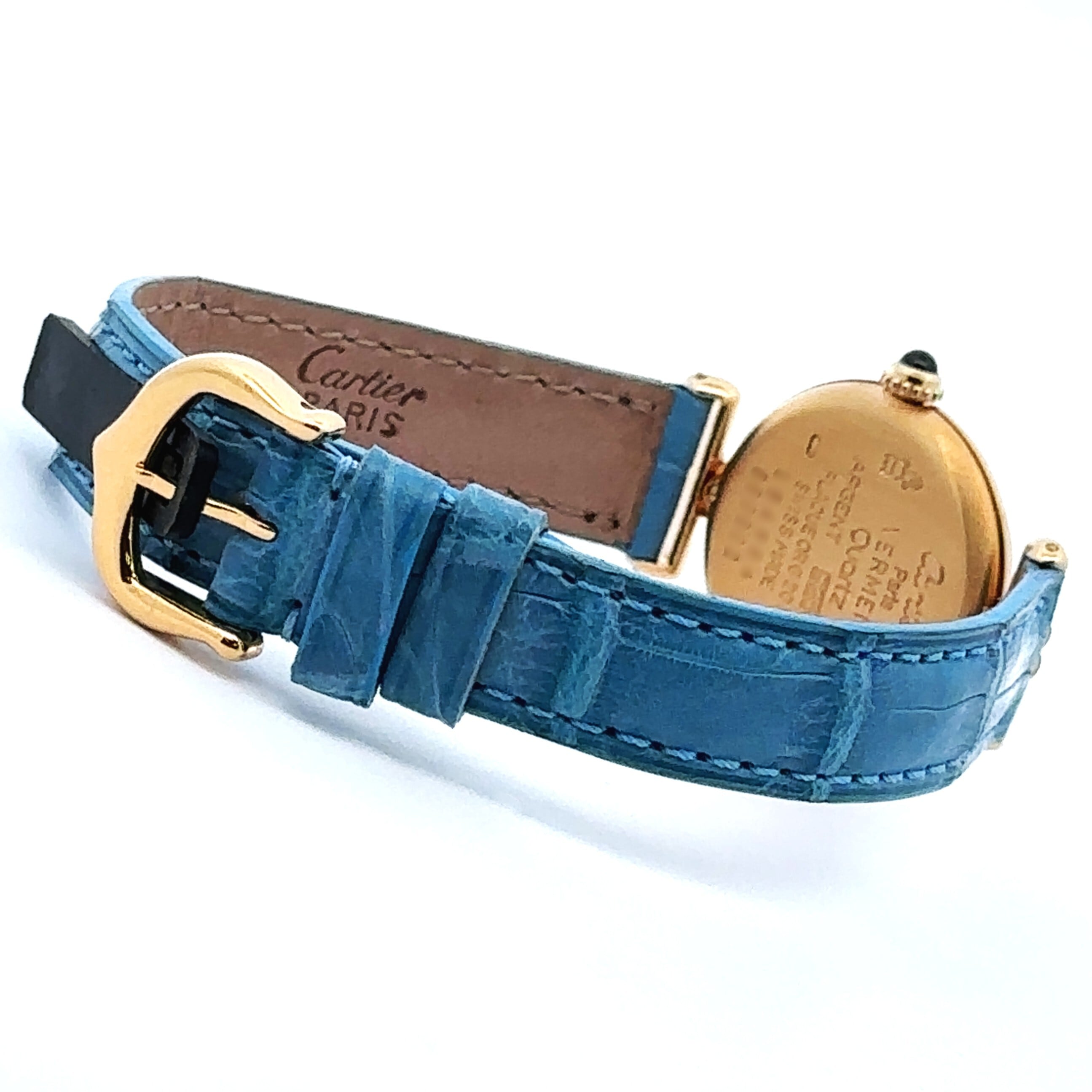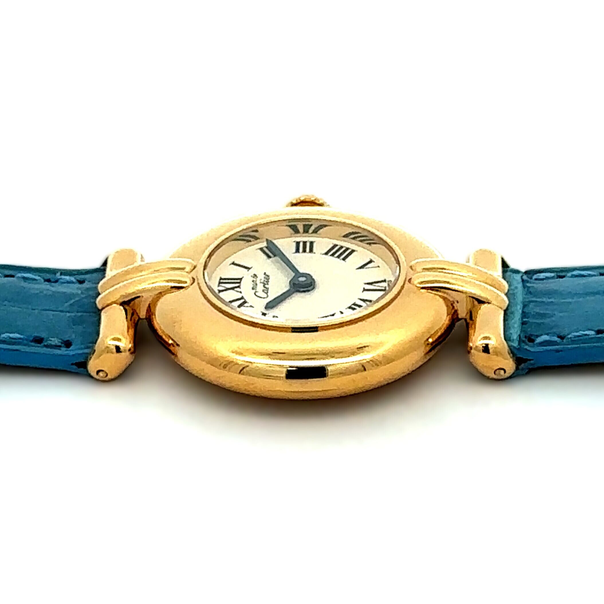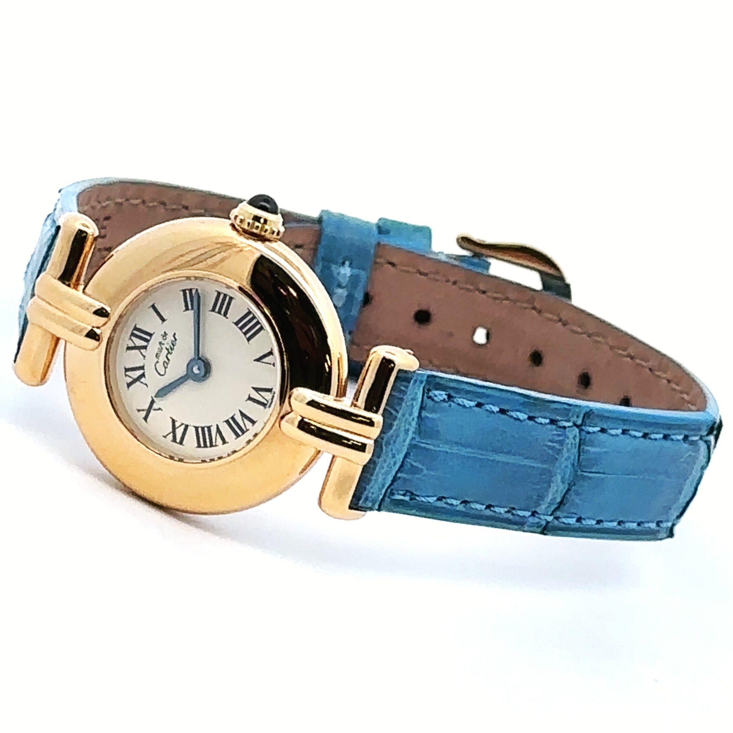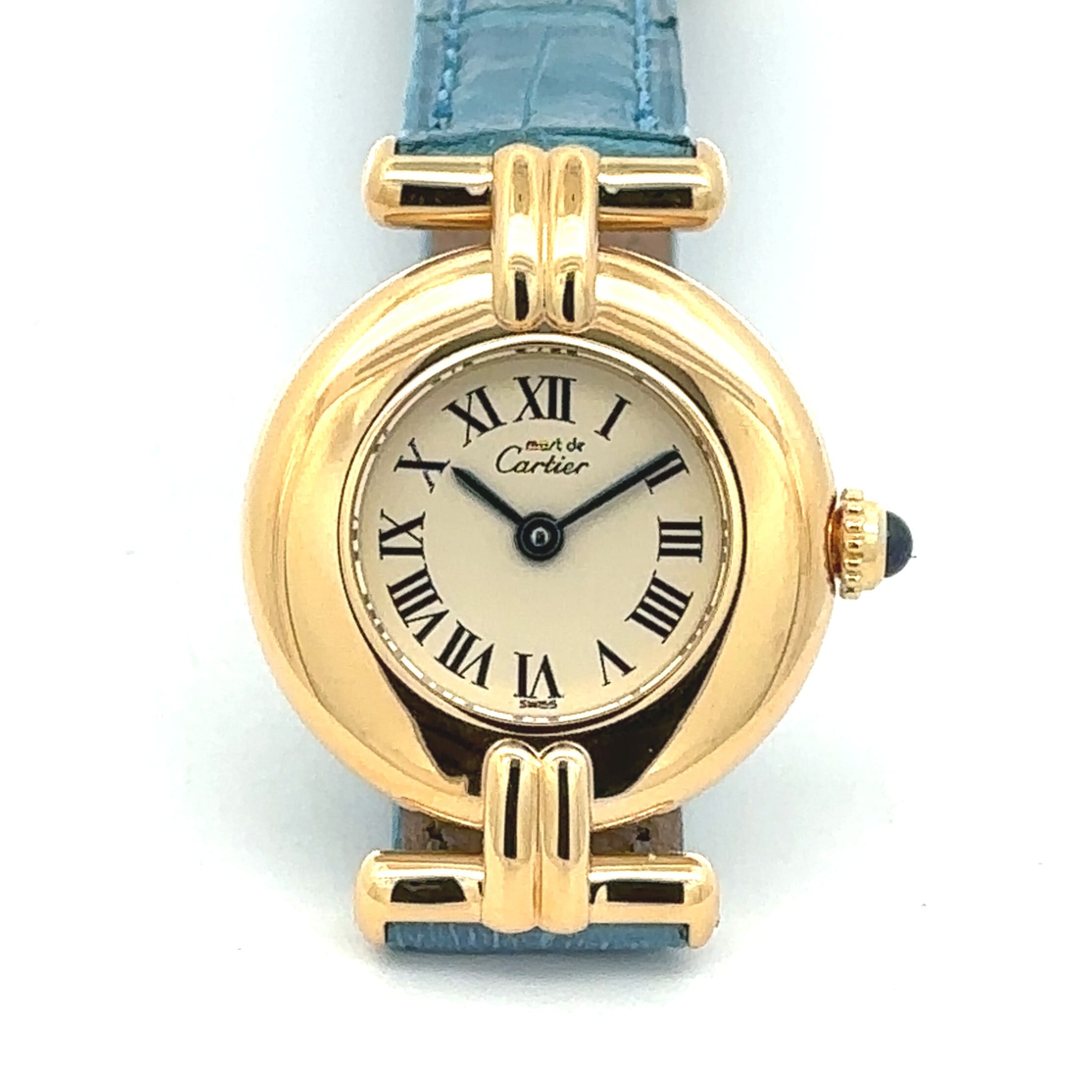 ころんと丸いフォルムがかわいい、カルティエの《マスト コリゼ》。小ぶりで品のあるゴールドケースに、ローマ数字の文字盤、そしてリューズに添えられたブルーのストーンがアクセントになった、まさに“さりげなくおしゃれ”な一本です。アンティーク時計が初めての方にも扱いやすいサイズ感で、普段のコーデにサッと馴染んでくれるのも魅力。爽やかなブルーのレザーベルトは、白シャツやデニム、ワンピースなどシンプルなファッションと相性抜群で、腕元がぐっと華やぎます。キレイめにもカジュアルにも合わせやすく、「ちょっと特別な雰囲気の時計が欲しい」という方にぴったりなモデルです。