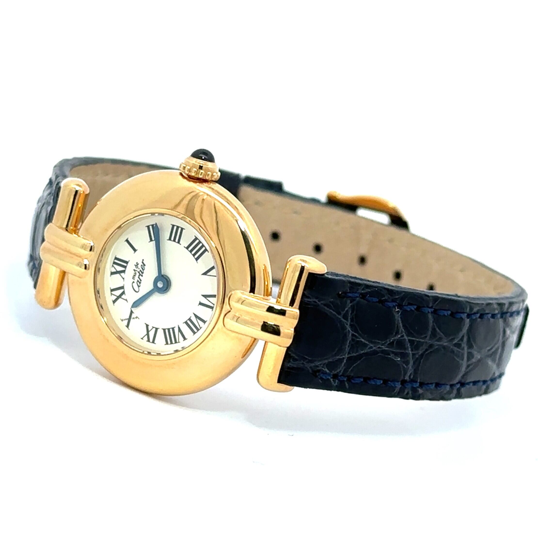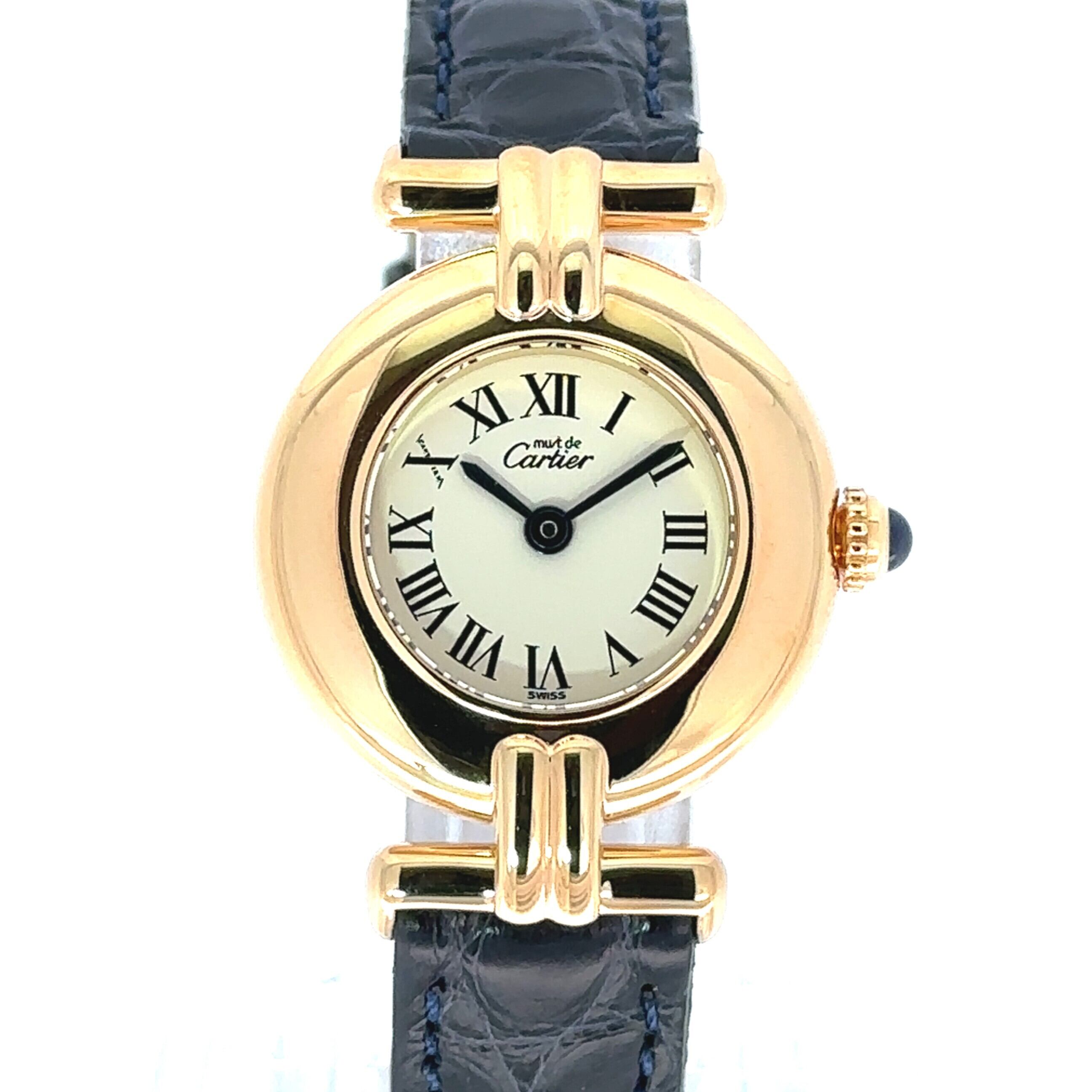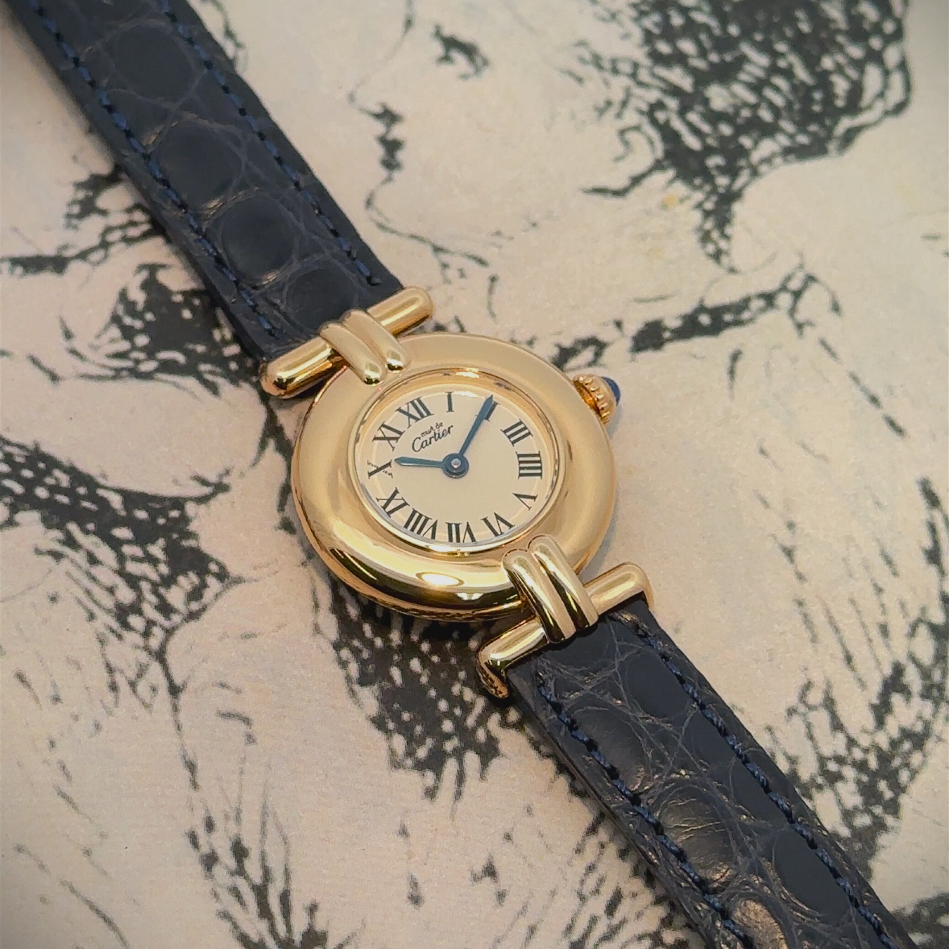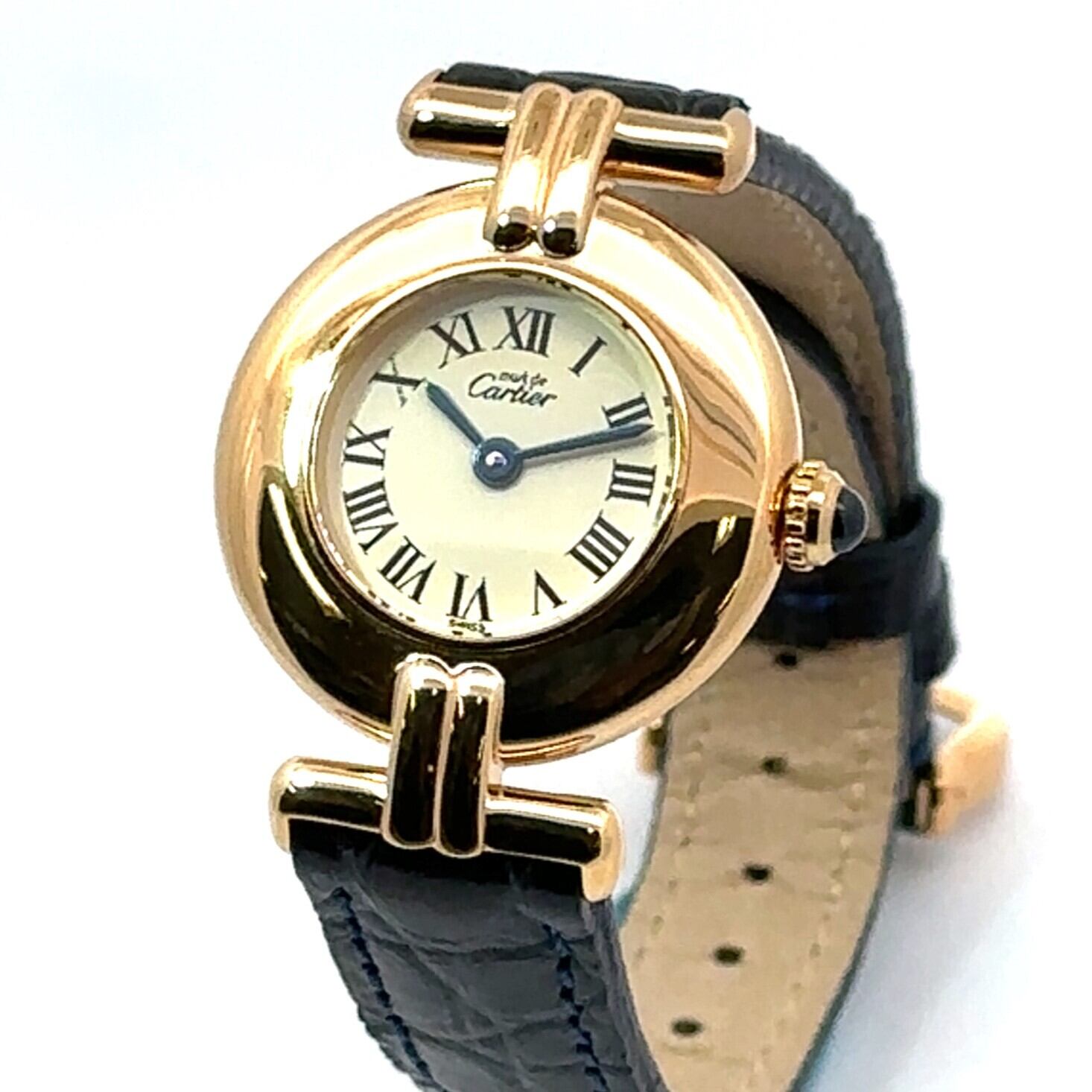 カルティエ マストコリゼは、丸みのある小ぶりなケースとローマ数字の文字盤が印象的なアンティークウォッチです。ゴールドカラーのケースに、落ち着いたネイビーカラーのレザーベルトが組み合わさり、上品ながらも気負わず使える一本。アンティーク時計が初めての方でも、アクセサリー感覚で取り入れやすいデザインです。