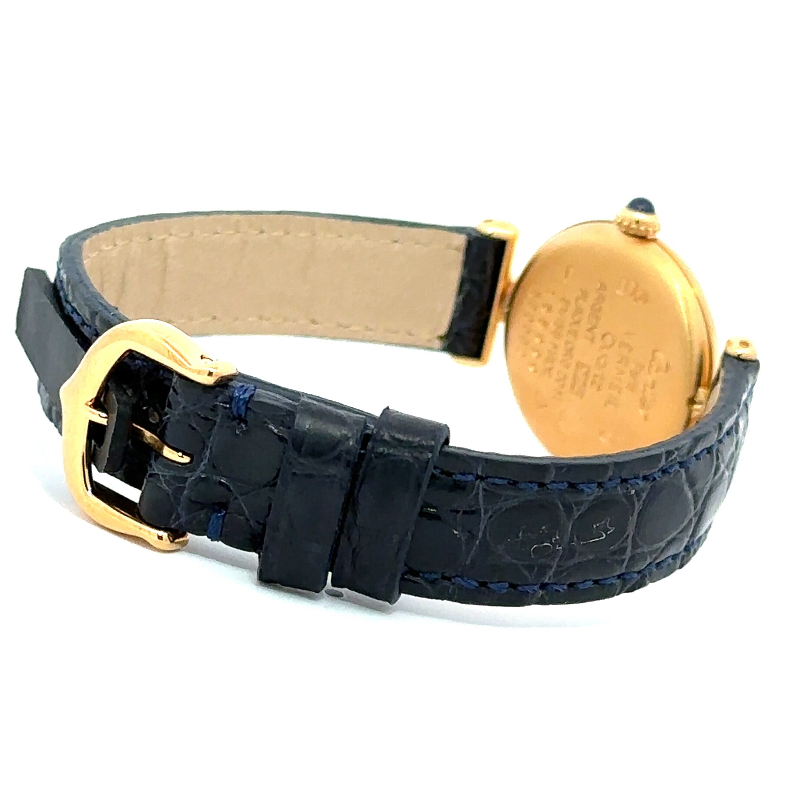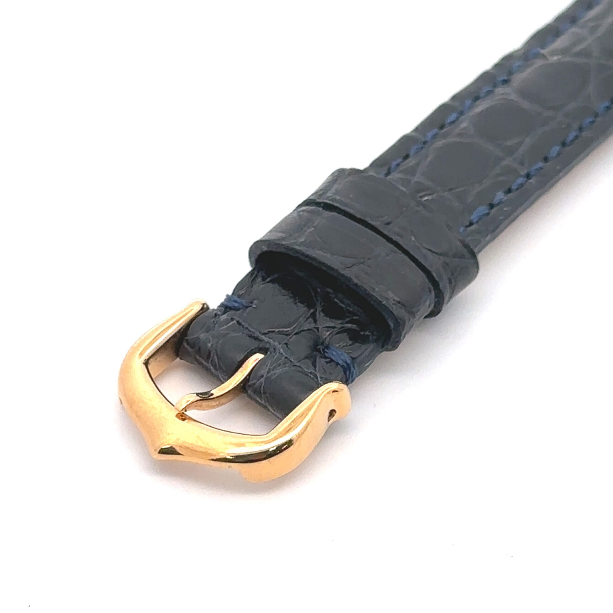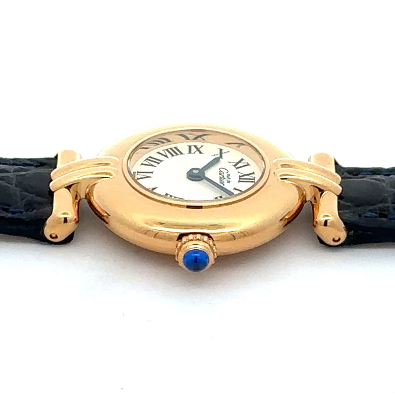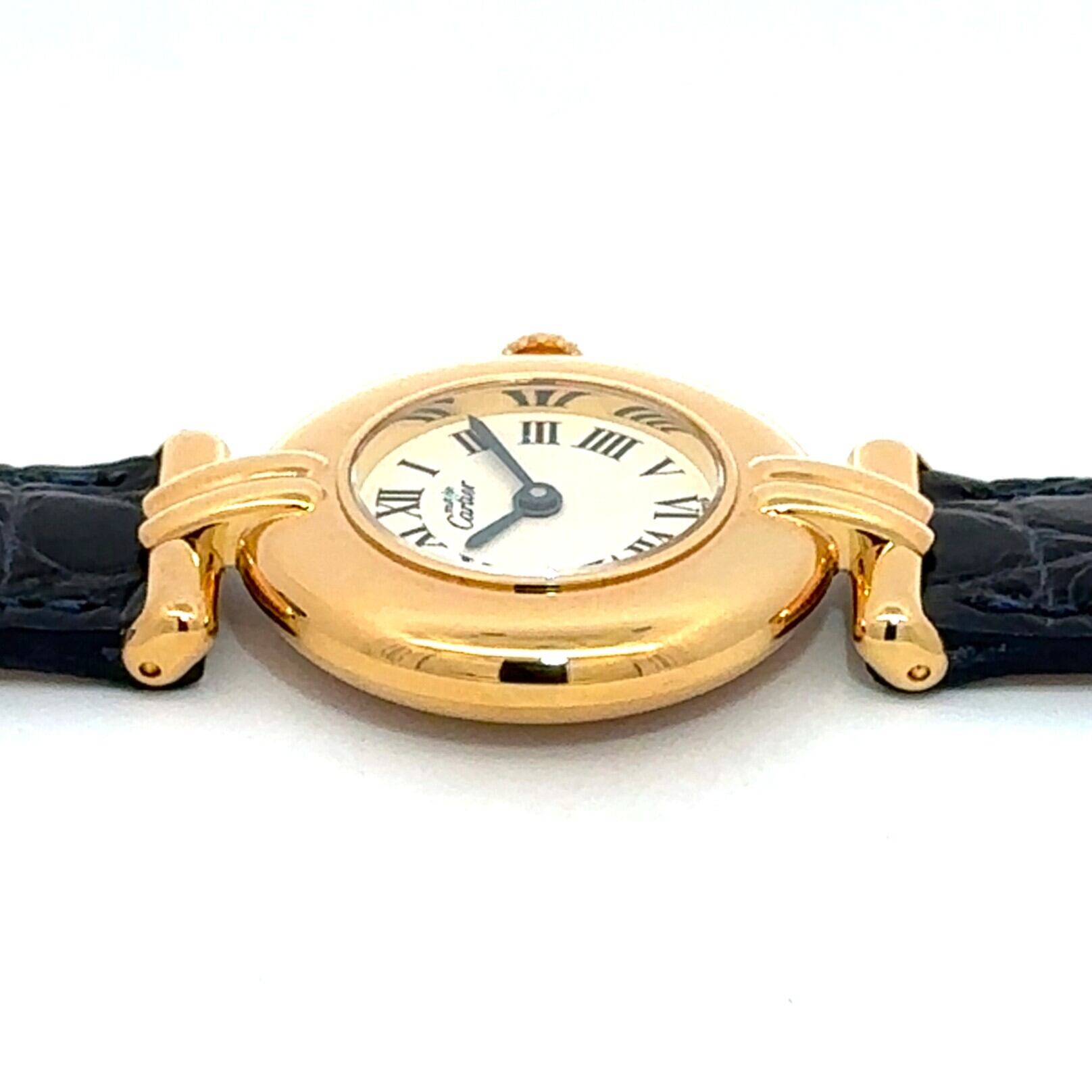 カルティエ マストコリゼは、丸みのある小ぶりなケースとローマ数字の文字盤が印象的なアンティークウォッチです。ゴールドカラーのケースに、落ち着いたネイビーカラーのレザーベルトが組み合わさり、上品ながらも気負わず使える一本。アンティーク時計が初めての方でも、アクセサリー感覚で取り入れやすいデザインです。