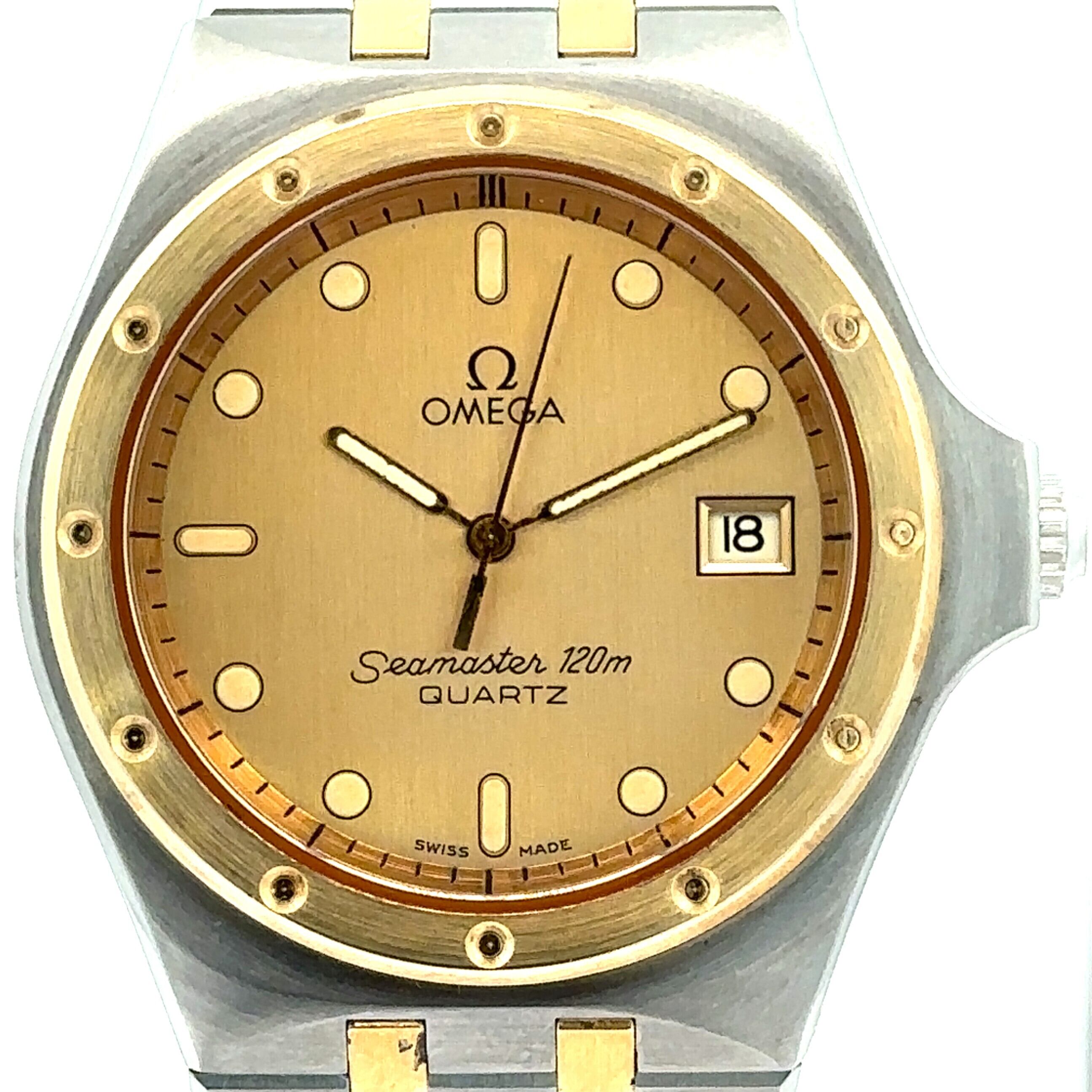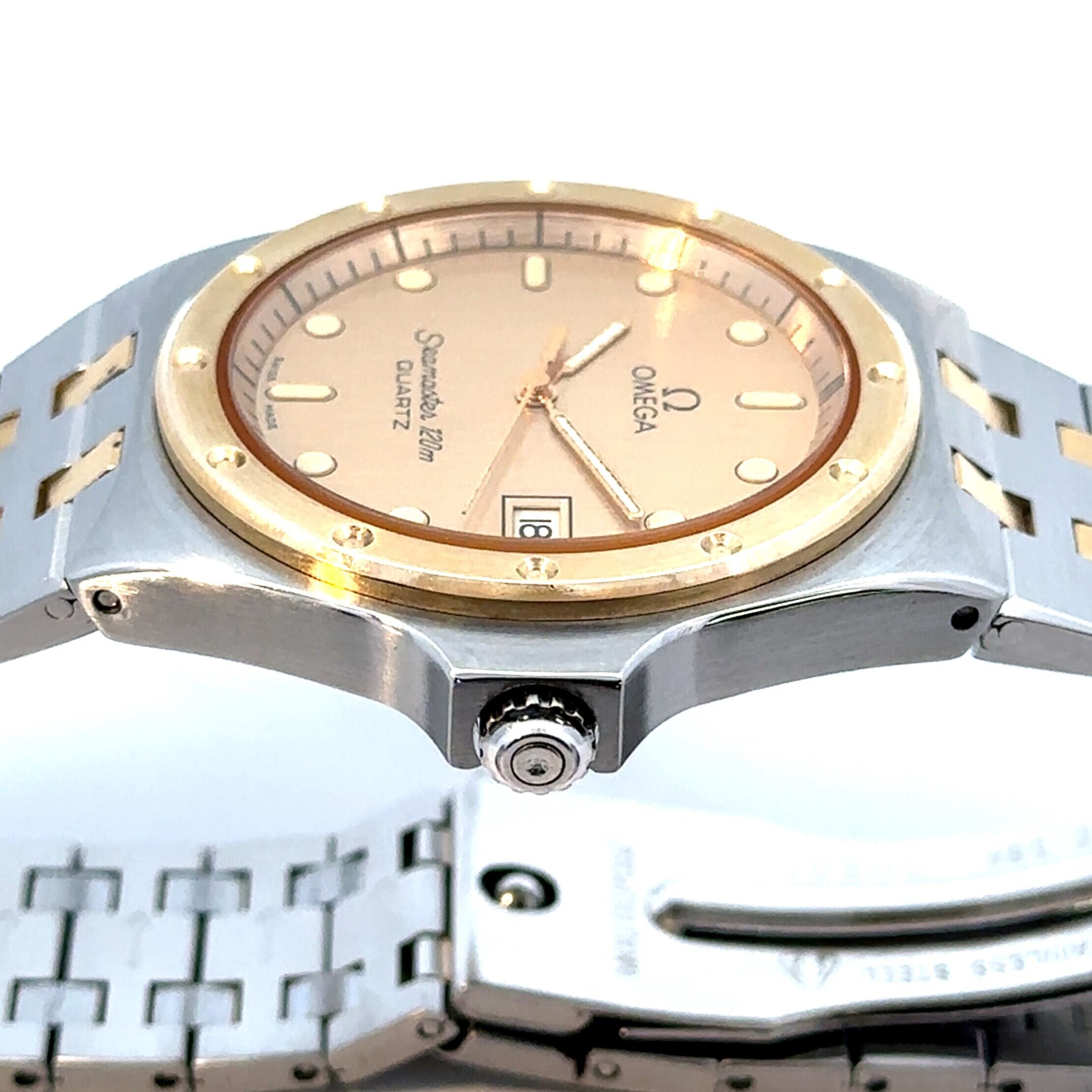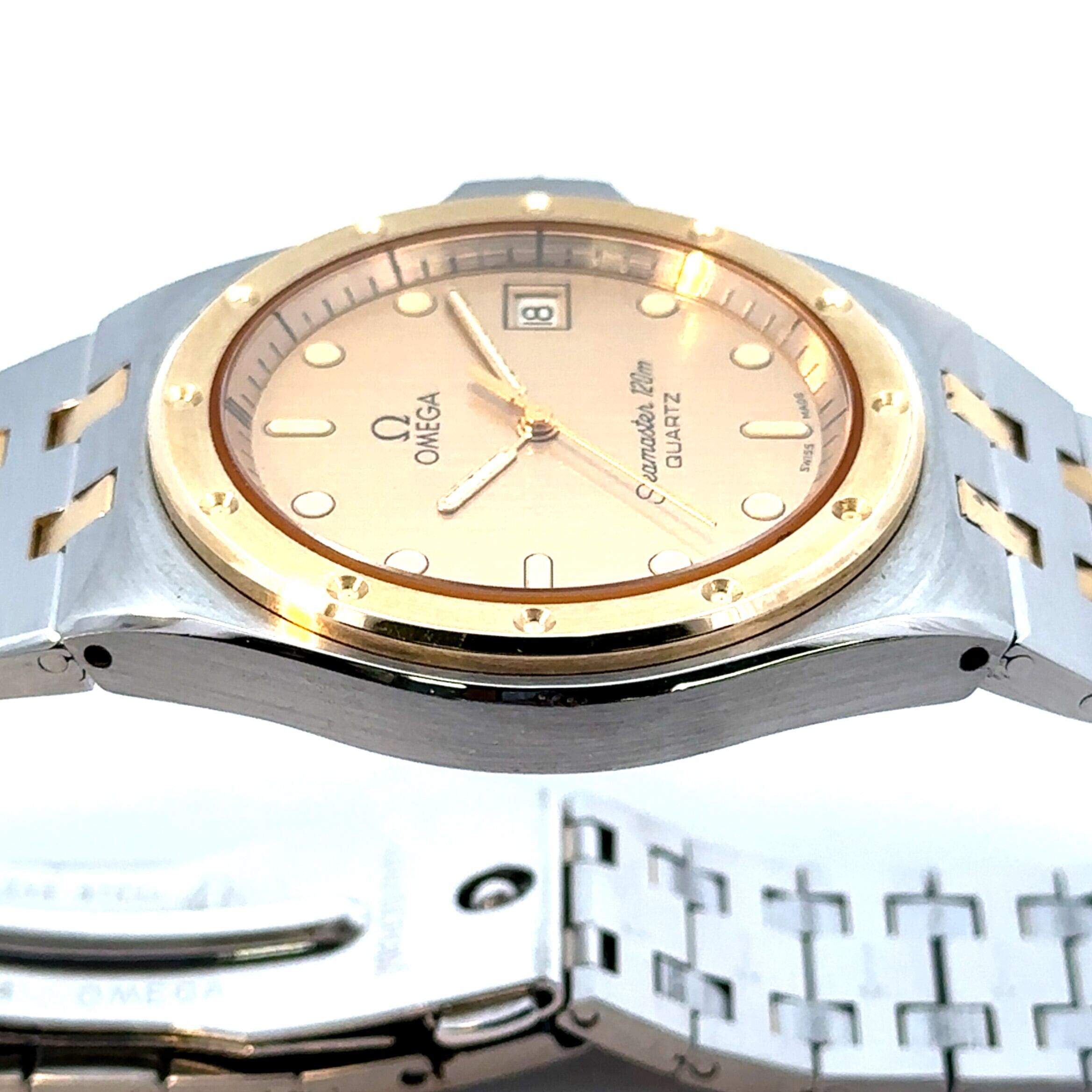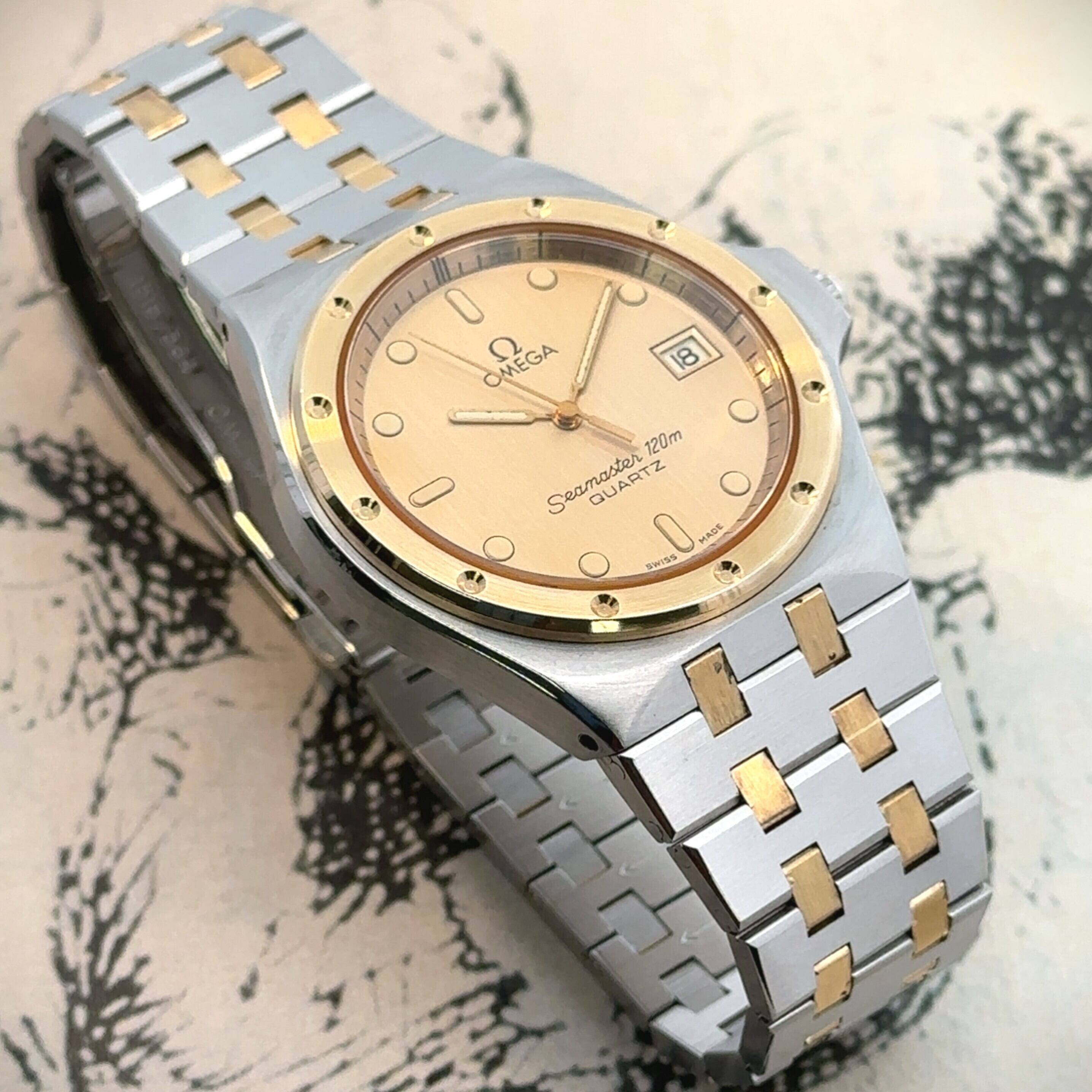 オメガの中でも長く愛されている定番モデル、《シーマスター》。こちらはステンレスとゴールドを組み合わせた上品なデザインで、アンティーク時計が初めての方にも取り入れやすい一本です。文字盤は落ち着いたゴールドカラーで視認性もよく、日付表示付きなので普段使いにも便利。程よくスポーティさがありながら、どこか大人っぽく洗練された雰囲気が魅力です。