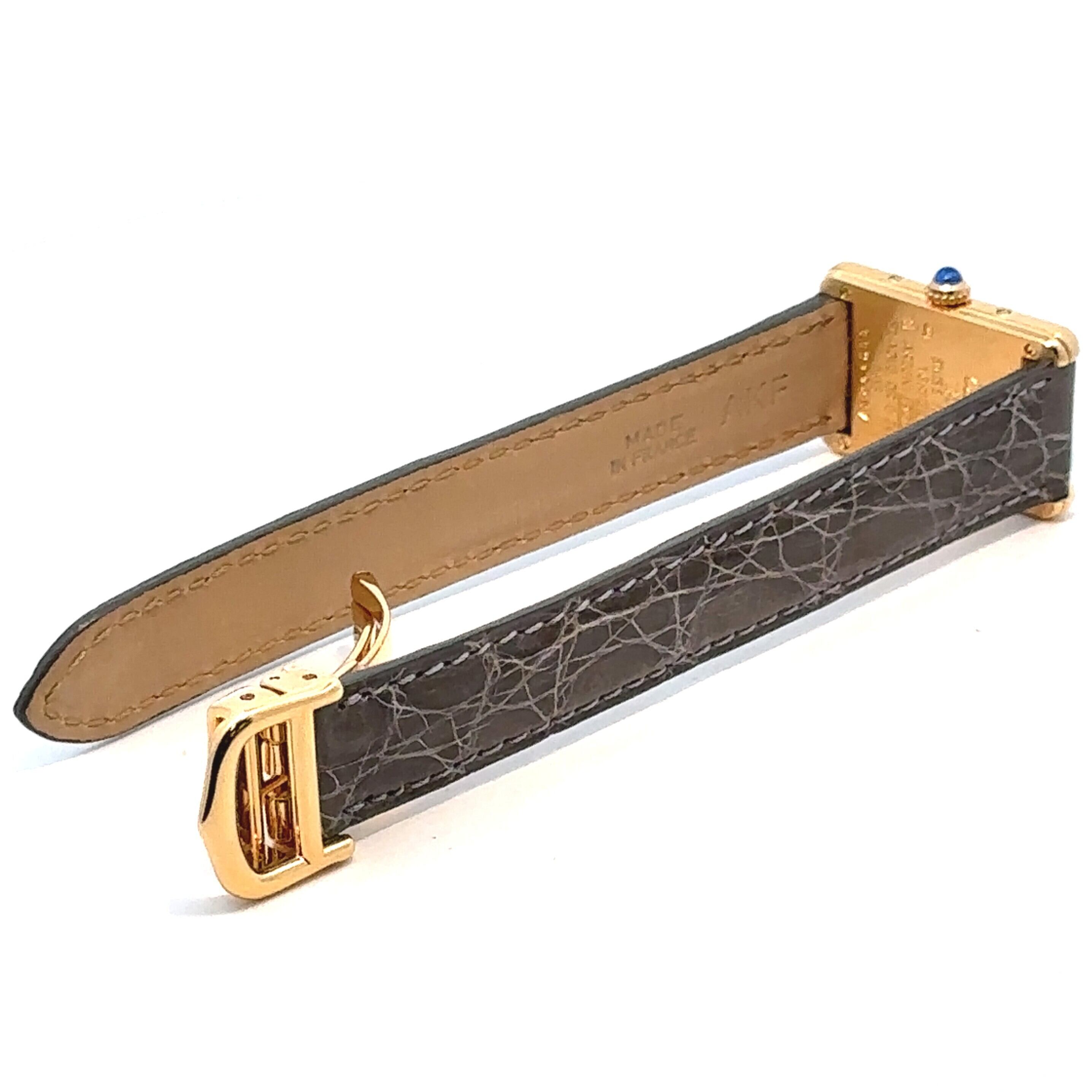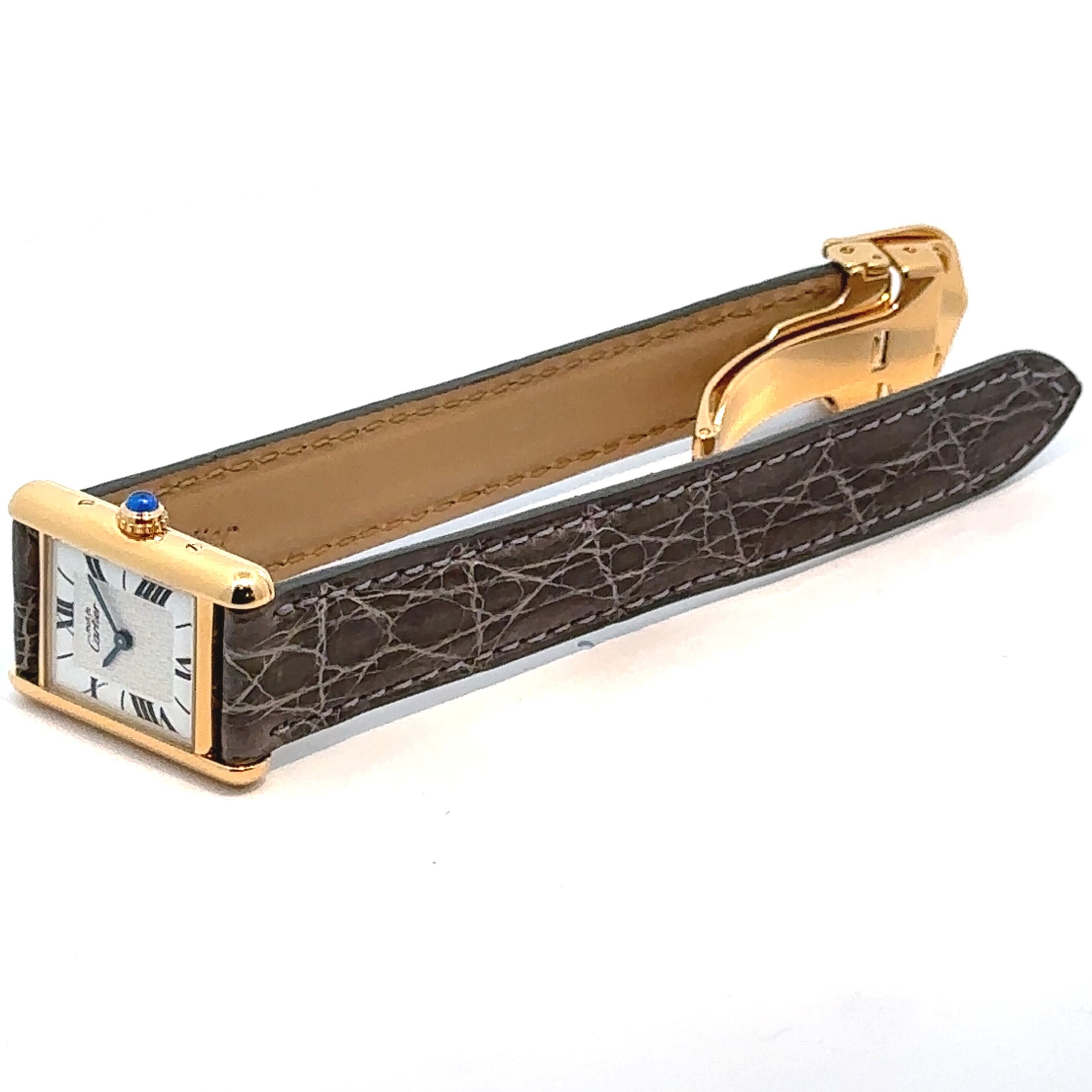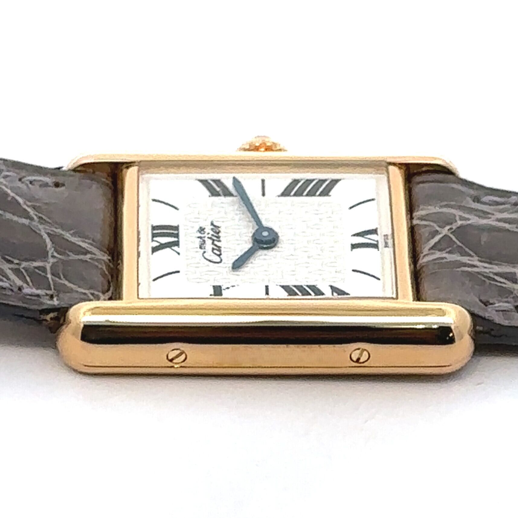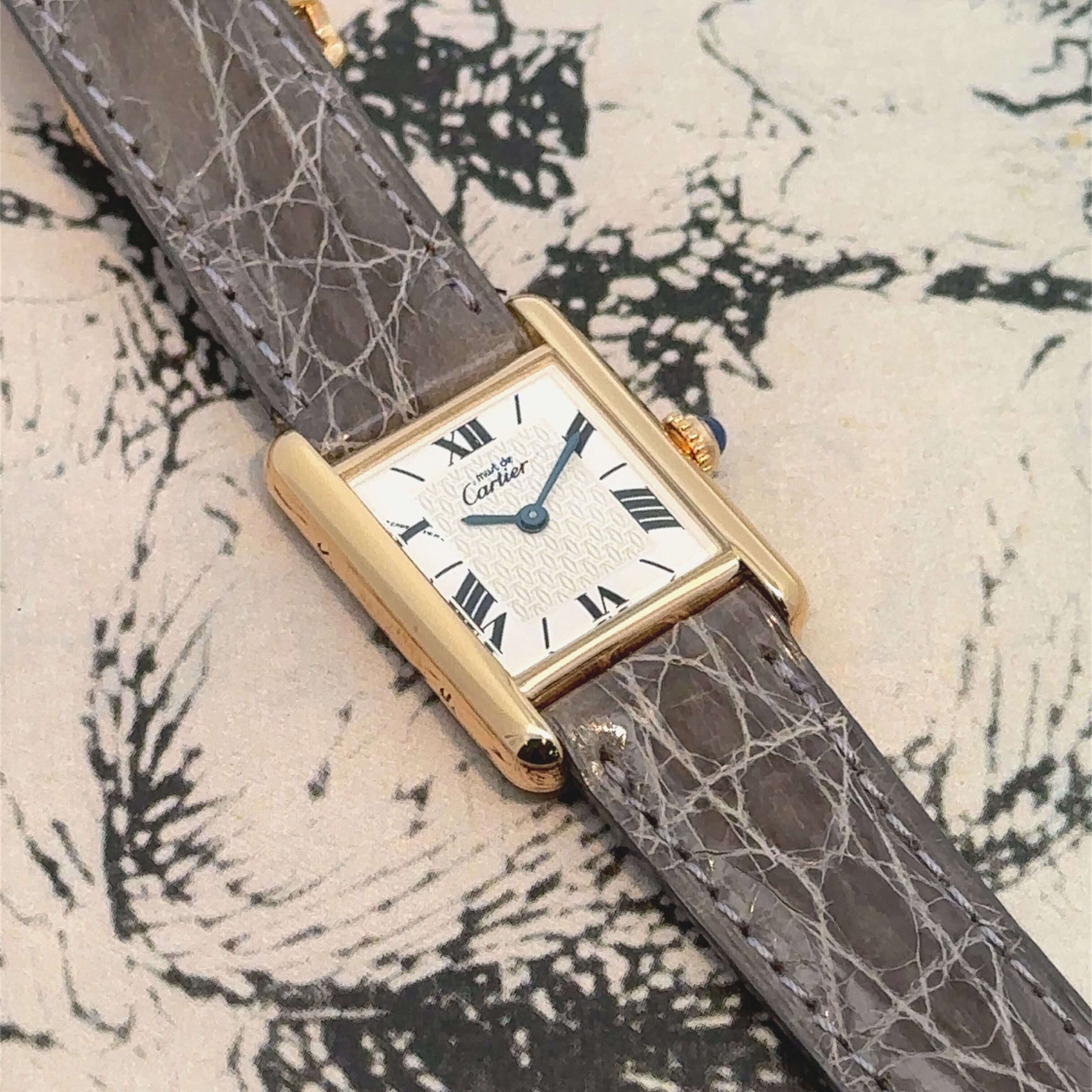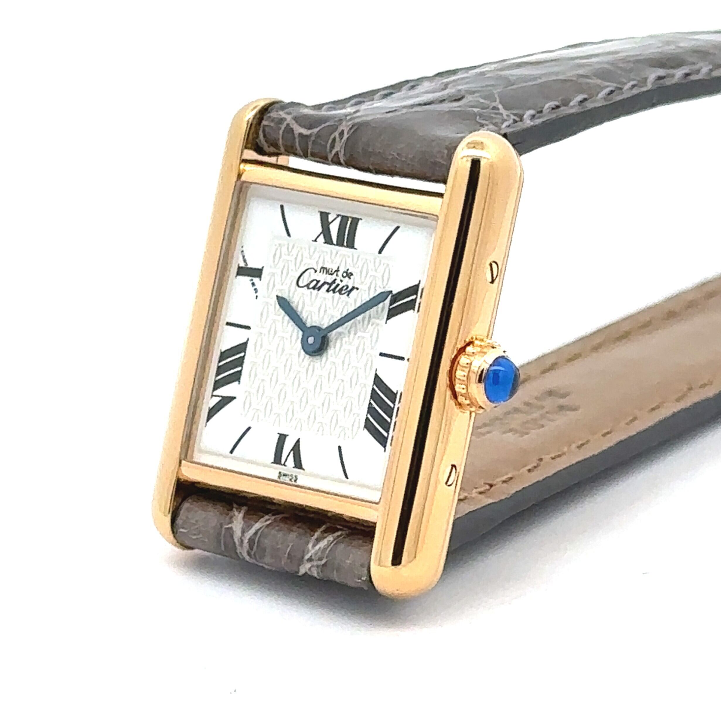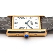 カルティエを代表する名作「タンク」を、より日常使いしやすくしたモデルが《マストタンク》です。縦長のスクエアケースに、ローマ数字の文字盤、リューズのブルーストーンといったタンクらしいデザインはそのままに、上品で落ち着いた雰囲気が魅力の一本。アンティーク時計が初めての方でも「見たことがある」と感じる、王道のデザインです。